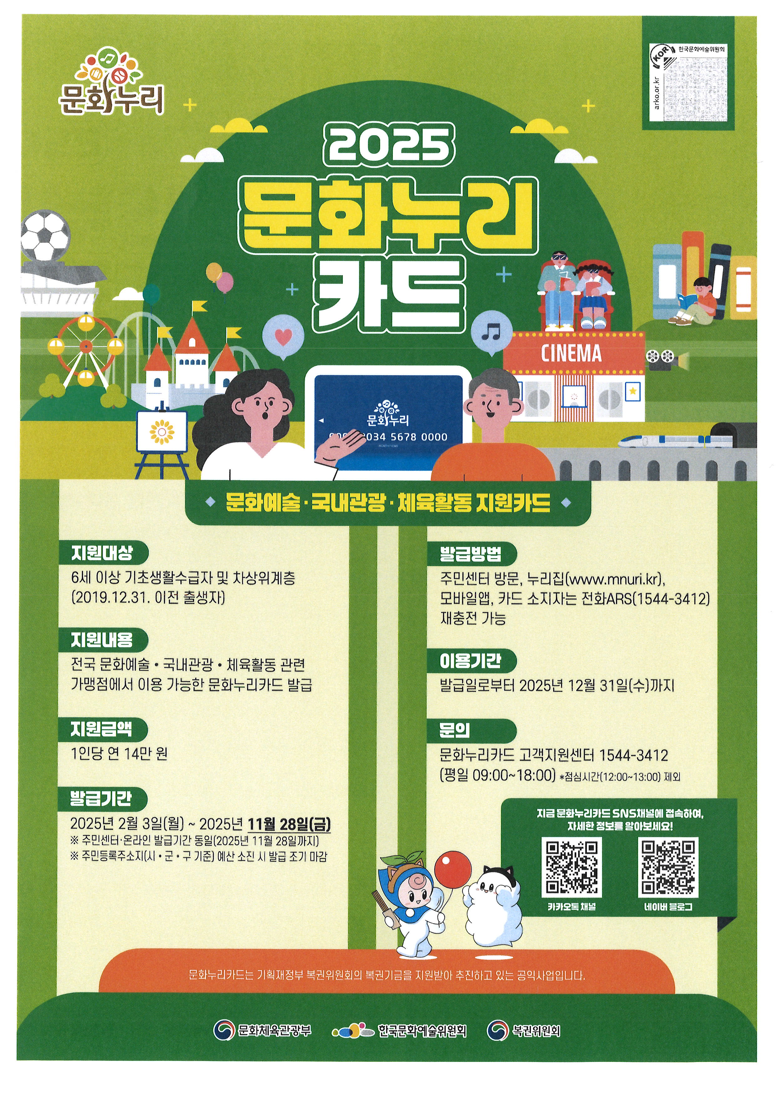 ○ 이용기간: 카드발급일로부터 ~ 12. 31.(수) ○ 지원대상: 만6세 이상 기초생활수급자 및 차상위계층 ※ 2019. 12. 31. 이전 출생자 ○ 지원금액: 1인당 연 14만원 ○ 내 용: 문화예술·국내관광·체육활동 등 문화 향유 위한 지원 ○ 신청방법: 관할 동주민센터 방문 신청 ○ 가 맹 점: 문화누리카드 홈페이지(www.mnuri.kr) 참고 ○ 문 의: 문화누리카드 고객지원센터(☎1544-3412) |