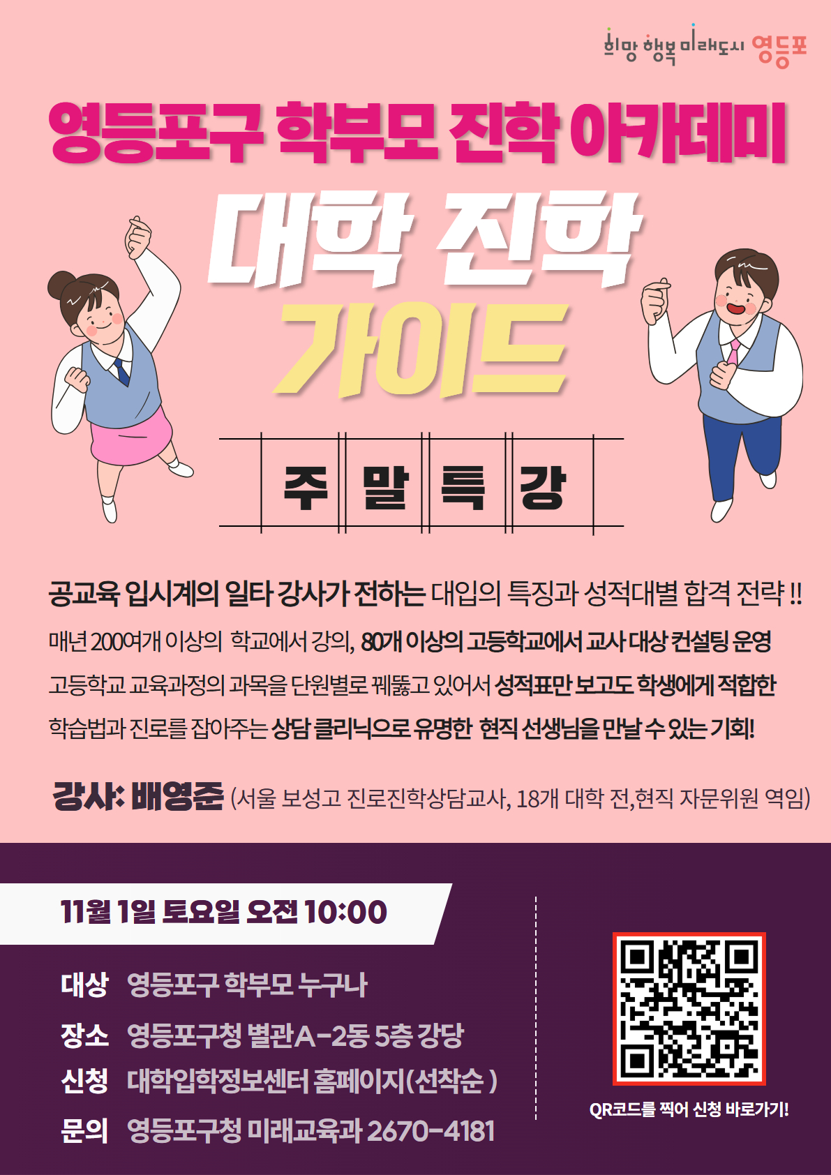 ★(주말특강 개설) 영등포구 학부모 진학 아카데미_대입편 ★ ○ 일 시: 2025. 11. 1.(토) 10:00 ~ 12:00 ○ 장 소: 영등포구청 별관A-2동 5층 강당 ○ 대 상: 영등포구에 거주하는 학부모 100명 ○ 내 용: 2026~2028학년도 대입 특징 및 성적대별 합격 전략 ○ 강 사: 배영준 (서울 보성고 진로진학 상담교사, 18개 대학 전,현직 자문위원 역임) ○ 신청방법: QR코드 혹은 링크 신청 ☞ (신청하기) https://share.google/qvGePrKtvwpcoIOkQ ○ 문 의 처: 영등포구청 미래교육과(☎02-2670-4181) 영등포 대학입학정보센터(☎02-2636-1621) |