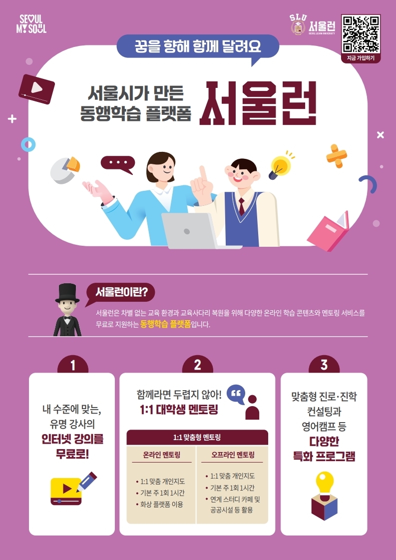 서울시에서 운영하는 공정한 교육 기회 제공을 위한 동행 학습 플랫폼 '서울런(Seoul Learn)' 에 대해 안내드립니다.