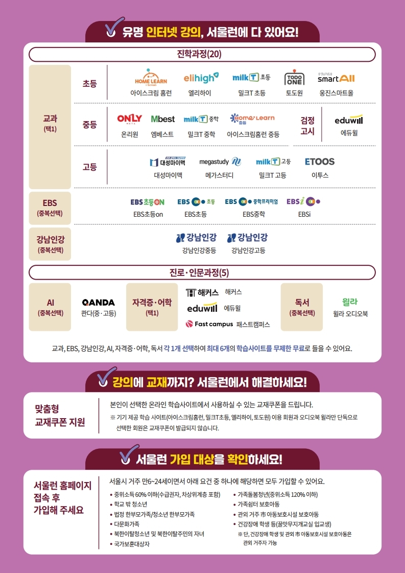 < 2025 서울런(Seoul Learn) > ○ 내용: 차별없는 교육환경과 교육사다리 복원을 위해 다양한 온라인 학습 콘텐츠와 멘토링 서비스를 무료로 지원하는 동행학습 플랫폼 ○ 지원대상: 서울시 거주 만6세~만24세이면서 소득 또는 자격 기준 적합자 (※자세한 소득·자격기준은 포스터 참조) ○ 지원내용 - 진학·진로·디지털·인문의 다양한 콘텐츠 제공 - 1:1 맞춤형 학습지원 제공 및 온·오프라인 멘토링 제공 - 동기부여 및 미래 인재 지원을 위한 장학프로그램 제공 ○문의: 서울런 학습지원센터(☎1533-0909) |