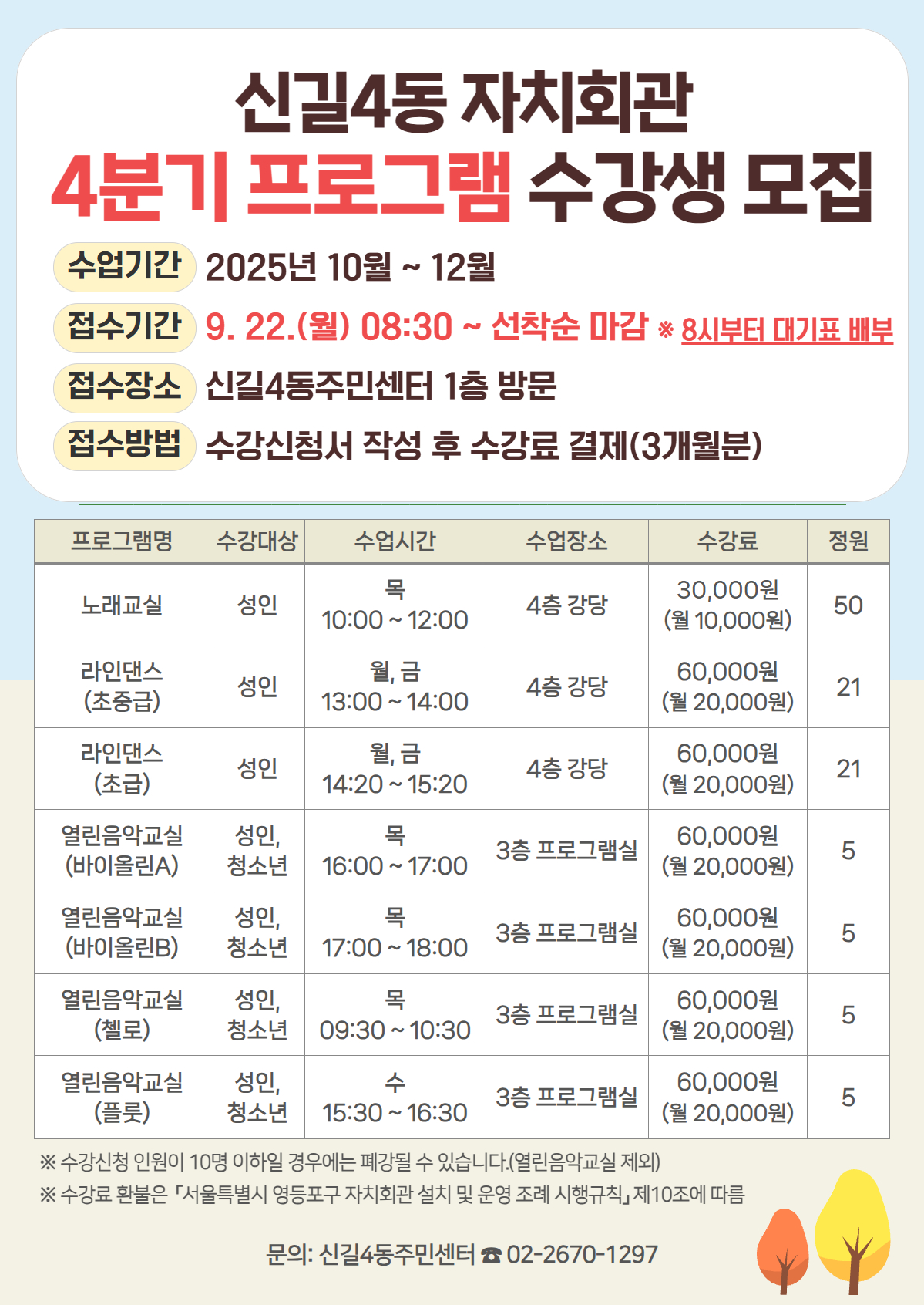 2025년 4분기 신길4동 자치회관 프로그램 수강생을 아래와 같이 모집하고자 하오니 주민 여러분들의 많은 관심과 참여 부탁드립니다.