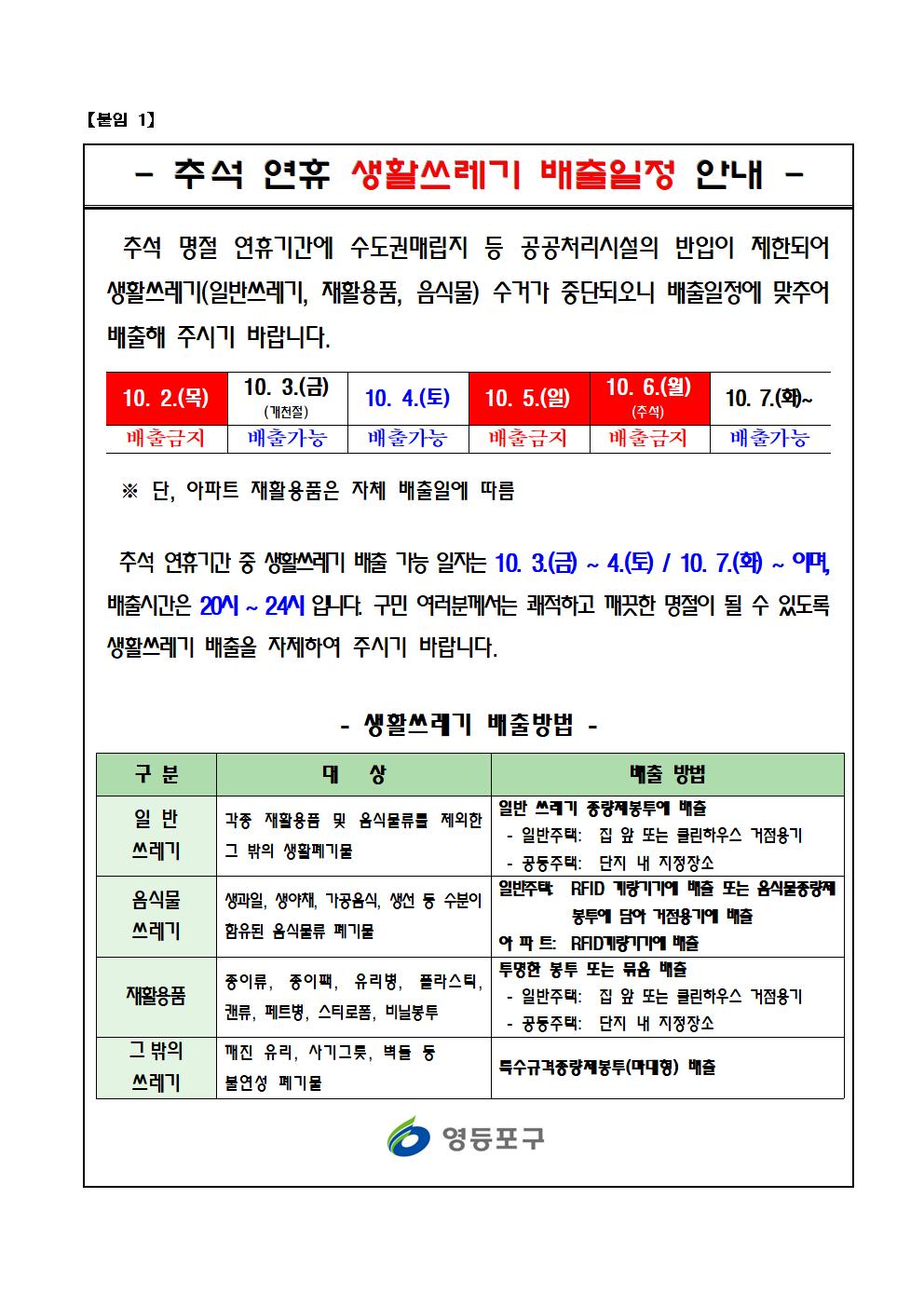우리동소식 홈 >동주민센터 >신길4동 >우리동소식 >우리동소식 프린트하기 sns 공유하기 페이스북 공유하기 블로그 공유하기 트위터 공유하기 공유하기 공유하기 조회수 34 작성일 2025.10.01 우리동소식 상세보기 - , 제목, 내용, 파일, 조회수, 작성일의 정보를 제공합니다. 추석 연휴 생활쓰레기 배출일정 안내 이미지 확대보기 추석 연휴 생활쓰레기 배출일정 안내드립니다. 파일 jpg 파일 추석 연휴 생활쓰레기 배출일정 안내문(최종).jpg 미리보기 목록 다음글 2025년 4분기 신길4동 자치회관 프로그램 수강생 모집