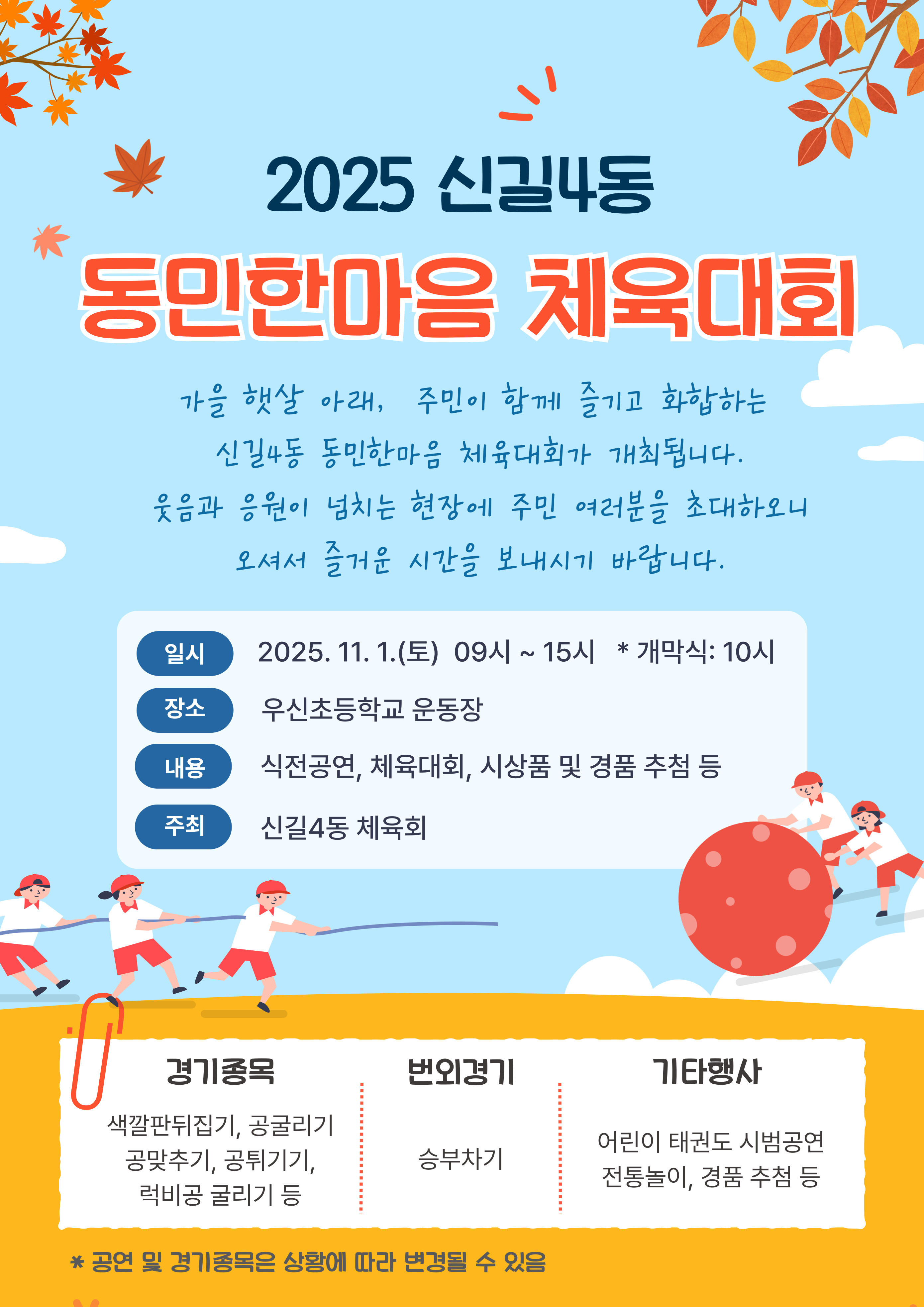 <2025 동민 한마음 체육대회 개최 안내> ○ 일 시: 2025. 11. 1.(토) 09:00 ※ 개회식: 10:00 ○ 장 소: 우신초등학교 운동장 ○ 참여인원: 400여명 ○ 내 용: 식전공연, 개회식, 종목별 경기, 시상 및 폐회식 등 - 종목별 경기: 색깔판뒤집기, 공굴리기, 공튀기기, 럭비공굴리기 등 ○ 주 관: 신길4동 체육회 |