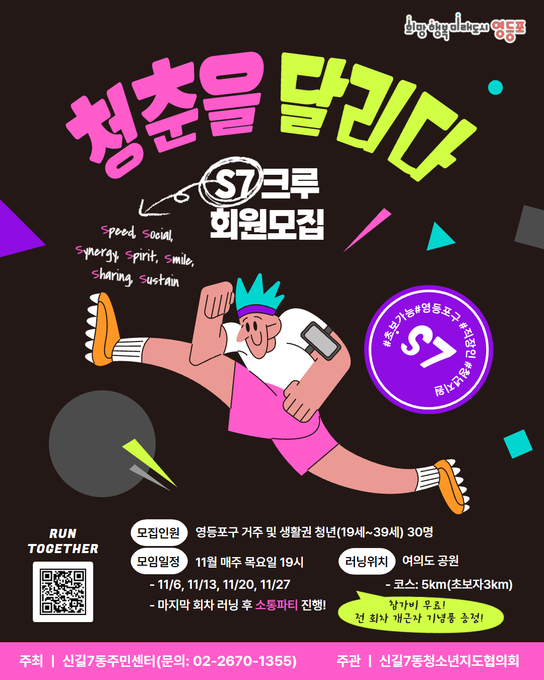 - 일 정: 11월 매주 목 19:00 (총 4회) · 1회차: 11. 6.(목) 19:00 · 2회차: 11. 13.(목) 19:00 · 3회차: 11. 20.(목) 19:00 · 4회차: 11. 27.(목) 19:00 * 마지막 회자 러닝 후 소통파티 진행예정 - 장 소: 여의도공원 - 내 용:영등포 또래끼리 함께 달리며 소통해요! [코스: 5km(초보: 3km)] - 참가비: 없음 - 주관: 신길7동청소년지도협의회 □ 모집내용 - 모집기간: ~ 11. 2.(일) - 모집인원: 영등포구 거주 및 생활권 청년(19~39세) 30명 * 영등포구 거주 청년 우선 선정 - 신청방법: 네이버폼 작성 (링크: https://naver.me/GagxjKVF) - 신청 시 유의사항 · 전회차 모두 참여 가능한 신청자 우선 선정(4회차 개근 참여자에게 기념품 증정!) · 개인정보 수집 및 이용 동의, 참여자 유의사항 등에 미동의 시 참여자 선정에 제한됨 □ 대상자 선정 - 선정 방법: 선착순 모집 ★ 모집 정원 초과 시 영등포구 거주 청년 우선 선정 - 선정 안내: 선정자 개별(문자)안내(11월 3일) ※ 미선정 시 별도 안내 없음 □ 문 의: 신길7동주민센터(☎ 02-2670-1355) |