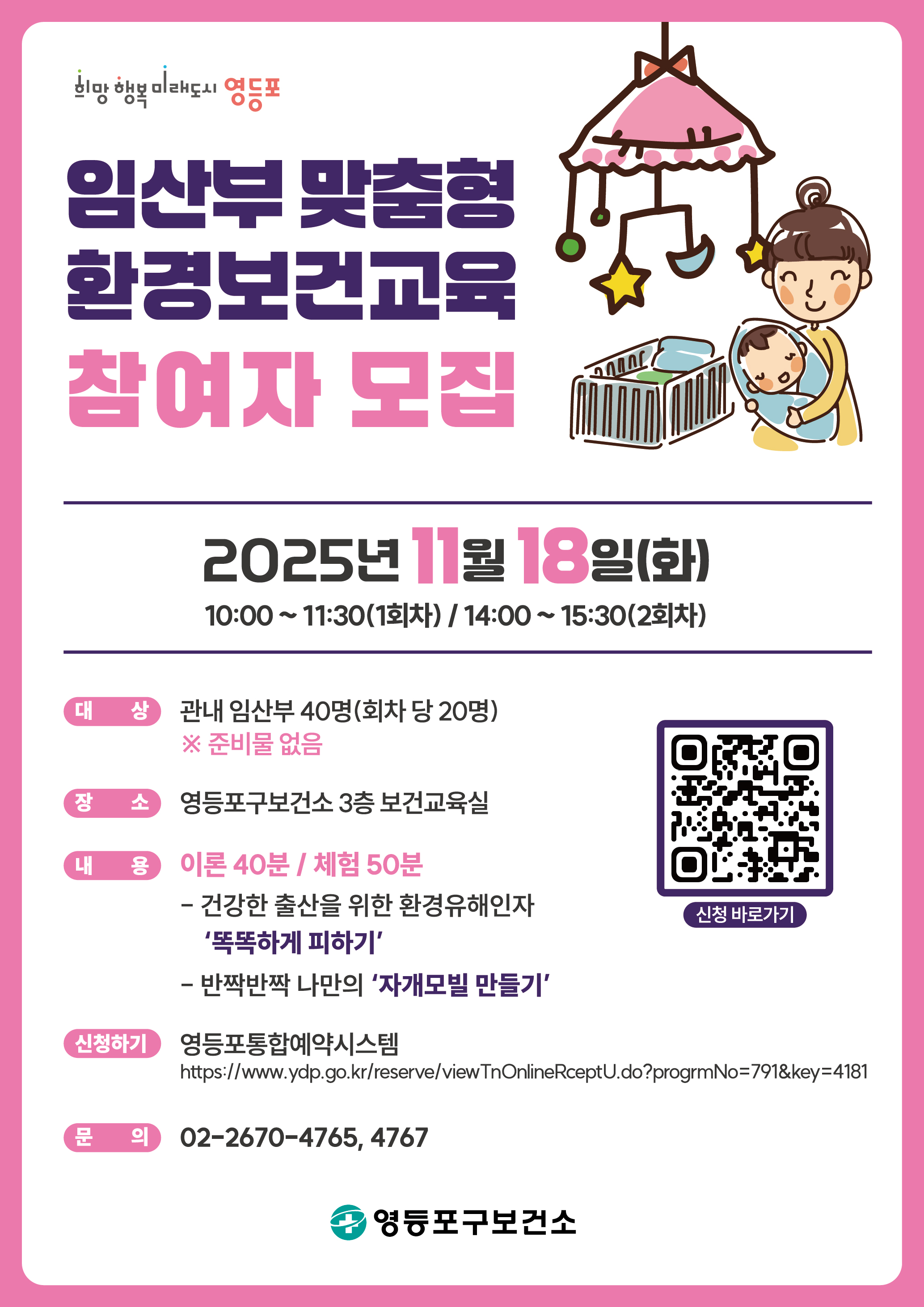- 나만의 자개모빌 만들기 참여자 모집 - □ 모집대상: 임산부 및 가족 40명 ※ 회차 당 20명 □ 일 시: 2025. 11. 18.(화) 10:00 ~ 11:30(1회차)/14:00 ~15:30(2회차) □ 장 소: 영등포구보건소 3층 보건교육실 □ 신 청: 영등포구청 통합예약 서비스 □ 내 용 ○ 건강한 출산을 위한 환경유해인자 '똑똑하게 피하기' ○ 반짝반짝 나만의 자개모빌 만들기 □ 신청기간: ~ 11. 17(월) 선착순 모집 □ 문의 : 영등포보건소 건강증진과 모자보건팀(02-2670-4765, 4767) |
