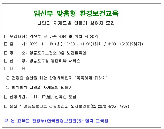 | 임산부 대상 맞춤형 환경보건교육 「나만의 자개모빌 만들기」 를 운영하오니, 관내 임산부와 가족 분들의 많은 참여바랍니다. | |