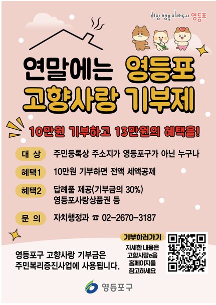 | 『영등포 고향사랑 기부제』 를 안내하오니, 많은 관심과 참여 바랍니다. | |