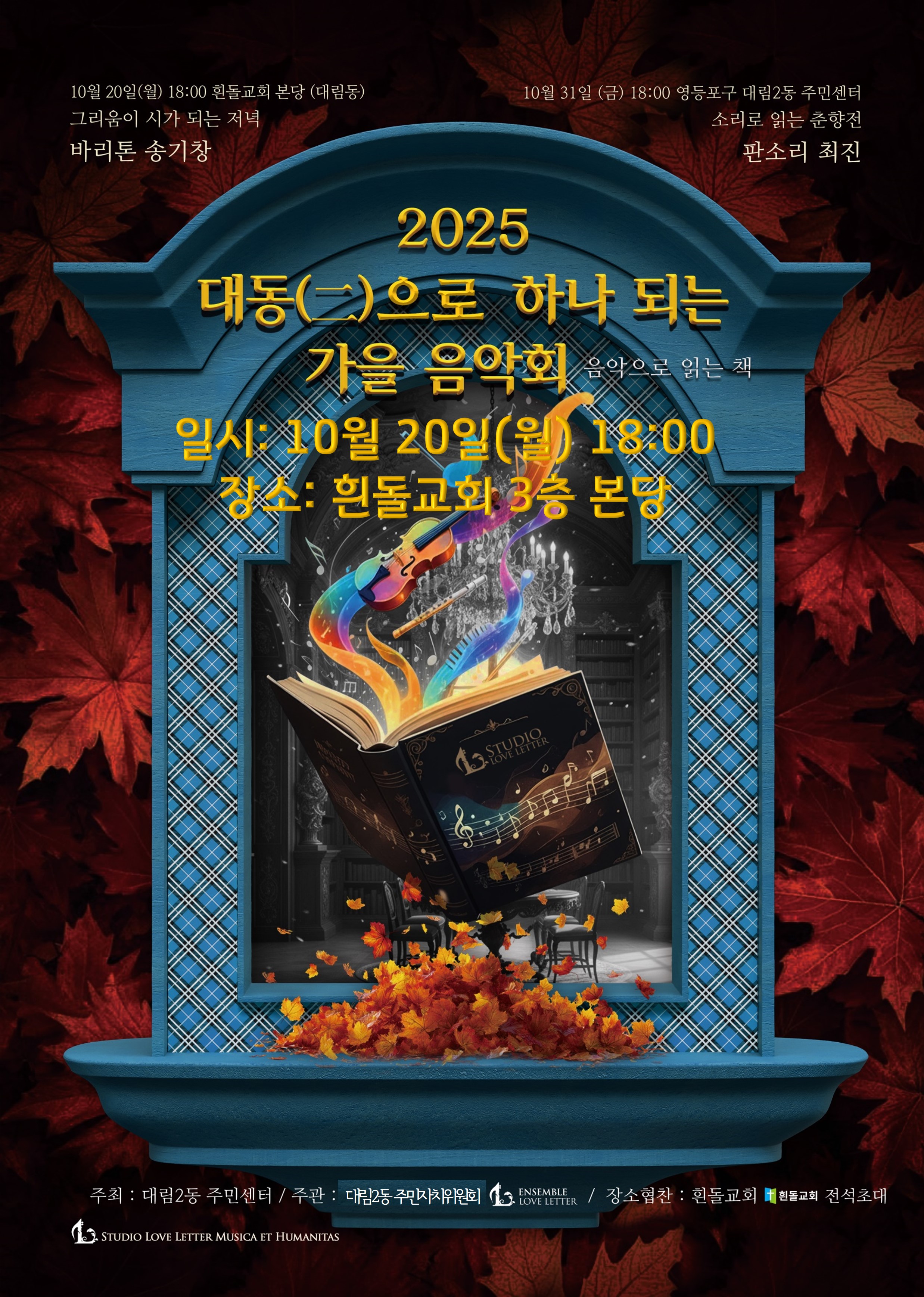 □ 행사 개요 1차 공연 2025. 10. 20.(월) 18:00 흰돌교회 3층 본당(대림로 107) 그리움이 시가 되는 저녁 (바리톤 송기창의 서정가곡) 2차 공연 2025. 10.31.(금) 18:00 대림2동주민센터 2층 다목적회의실(대림로23길 25) 소리로 읽는 춘향전 (판소리 최진) 참여대상 청결지킴이, 직능단체 회원, 주민자치위원 및 지역주민 등 |
