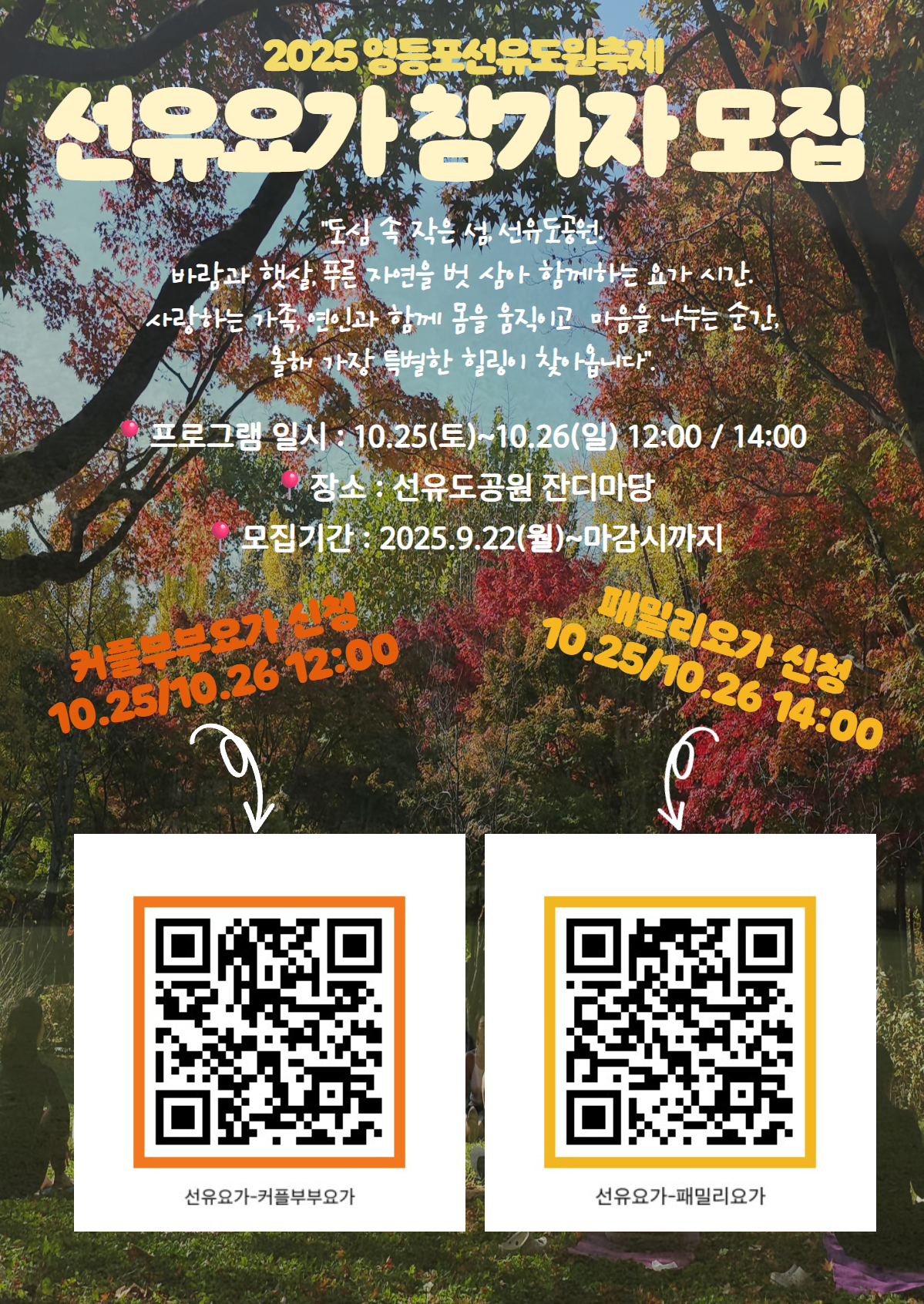 선유도원축제 「선유요가」 참가자 모집 자연 속에서 가족과 함께 호흡을 맞추는 힐링의 시간, 선유요가에 여러분을 초대합니다. 선유도공원의 잔디 위에서 사랑하는 사람과 함께 특별한 주말을 즐겨보세요. ○ 프로그램 개요 · 행 사 명: 선유요가 · 일 시: 2025년 10월 25일(토) ~ 10월 26일(일) - 12:00 부부·커플 요가 - 14:00 패밀리 요가 · 장 소: 선유도공원 잔디마당 · 대 상: 가족 단위, 부부·커플 누구나 (초등학생 이상 참여 가능) · 모집인원: 회차별 60명 내외 (선착순 마감) ○ 참가방법 · 온라인 사전 신청 - 신청방법: QR코드를 통한 구글폼 신청 자세한 내용은 영등포문화재단 홈페이지를 참고해주세요. ※ 영등포문화재단 홈페이지 선유요가 신청하기 → https://www.ydpcf.or.kr/postview.do?bid=1&pid=2325 |
