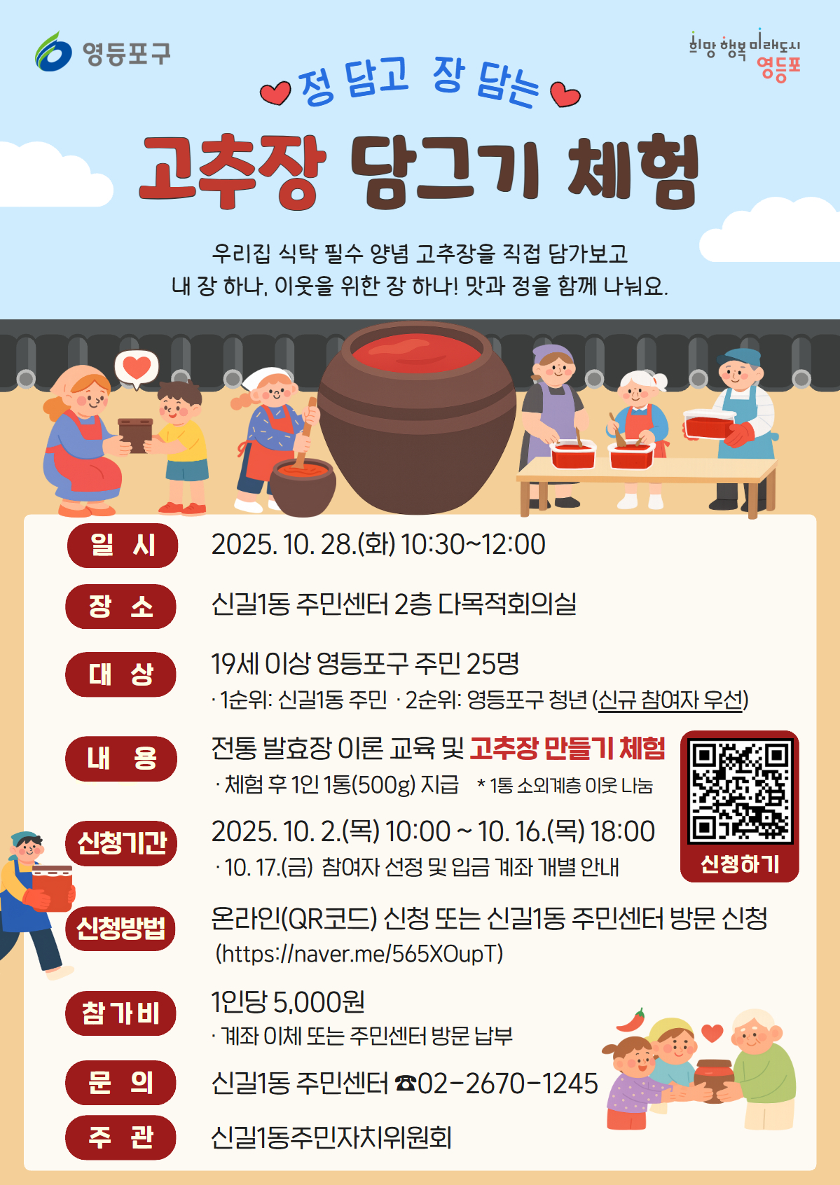 □ 행사 개요 ✔ 일 시: 2025. 10. 28.(화) 10:30~12:00 ✔ 장 소: 신길1동 주민센터 2층 다목적회의실 ✔ 대 상: 19세 이상 영등포구 주민 25명 - 1순위: 신길1동 주민, 2순위:영등포구 청년, *신규 참여자 우선 ✔ 내 용: 전통 발효장 이론교육 및 고추장 만들기 - 체험 후1인 1통(500g)지급, 1통 소외계층 이웃 나눔 ✔ 신청기간: 2025. 10. 2.(목) 10:00 ~ 10. 16.(목) 18:00 - 10. 17.(금) 참여자 선정 및 입금 계좌 개별 안내 - 10. 20.(월)부터 잔여석 추가 모집 예정 ✔ 신청방법: 온라인(QR코드)신청 또는 주민센터 방문 신청 -참여링크: https://naver.me/565XOupT ✔ 참 가 비: 1인당 5,000원(현금,계좌이체 또는 주민센터 방문 납부) ✔ 문 의: 신길1동 주민센터(☎02-2670-1245) ✔ 유의사항 -프로그램 운영 중 사업 홍보를 위한 사진 촬영이 있을 수 있습니다. -참가비 입금 완료 시 신청이 최종 완료됩니다. (참여자 선정 안내 시 입금 계좌 공지, 이체 시'고추장+성함'기재) -10. 19.(일)까지 입금하지 않을 경우 신청은 자동 취소되며, 후순위 신청자에게 참여 기회가 넘어갑니다. -취소 및 환불은 프로그램 7일 전(10. 21.(화))까지 가능하며, 참가비 환불은프로그램 종료 후 10일 이내 정산 후 진행 예정입니다. |