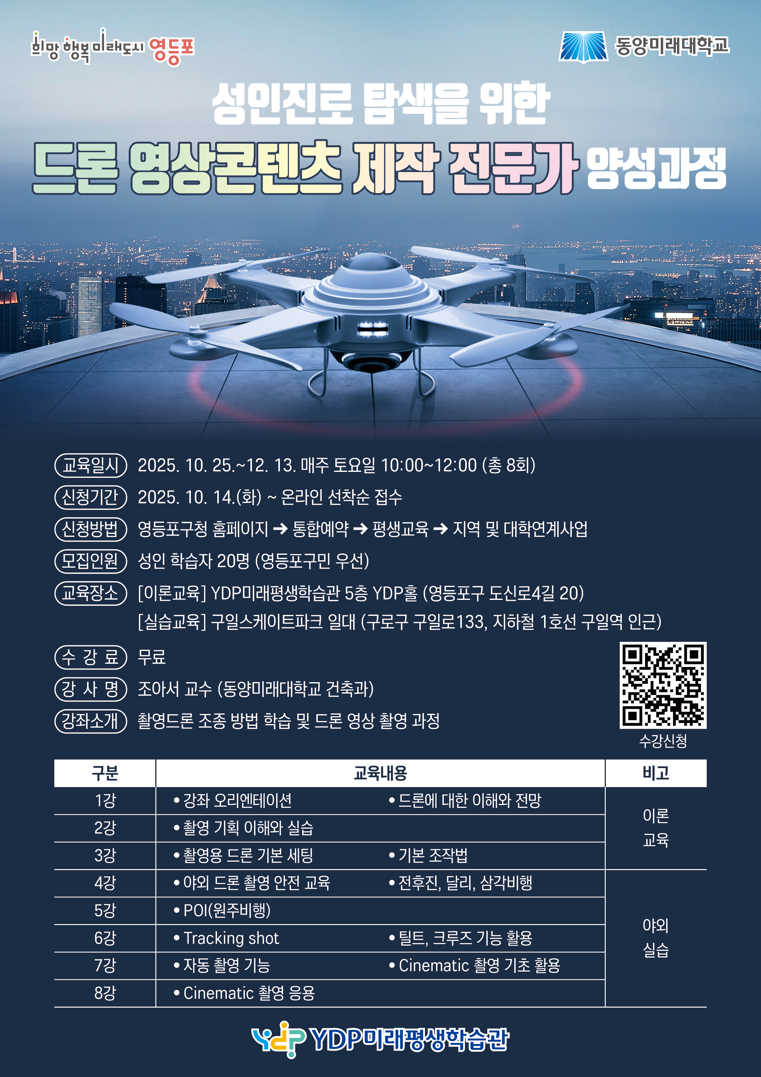 ○ 신청기간 : 2025. 10. 14.(화) ~ 선착순 ○ 교육기간 : 2025. 10. 25.(토) ~ 12. 13.(토) 매주 토요일 10:00~12:00 / 총 8회기 ○ 교육장소 : YDP미래평생학습관 5층 YDP홀 등 [이론교육] YDP미래평생학습관 / 영등포구 도신로4길 20 [실습교육] 구일스케이트파크 일대 / 구로구 구일로133 (지하철 1호선 구일역 1번출구 인근) ○ 교육대상 : 성인 학습자 20명 (영등포구민 우선) ○ 교육강사 : 조아서 교수 (동양미래대학교 건축과) ○ 교육내용 : 촬영용 드론 기본 세팅, 야외 드론 촬영 등 (이론교육 3회, 실습교육 5회) ○ 신청방법 : 구 홈페이지 인터넷접수 (통합예약-평생교육-지역 및 대학연계사업) |