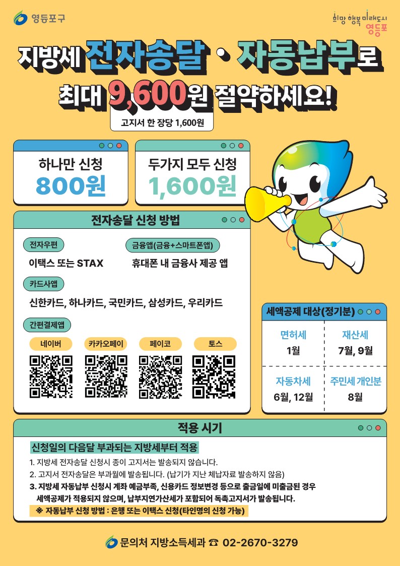 전자송달 자동납부 신청 현장 행사 ○ 운영기간 : 2025.10.25.(토) ∼ 10.26.(일) ○ 운영장소 : 시월의 선유 축제 행사장 ○ 운영방법 : 현장 홍보 부스 운영 -. 지방세 전자송달제도 안내 및 즉석 신청 지원 · QR코드 배너를 통한 모바일 신청 · 전자송달 수기 신청서 접수 병행 |