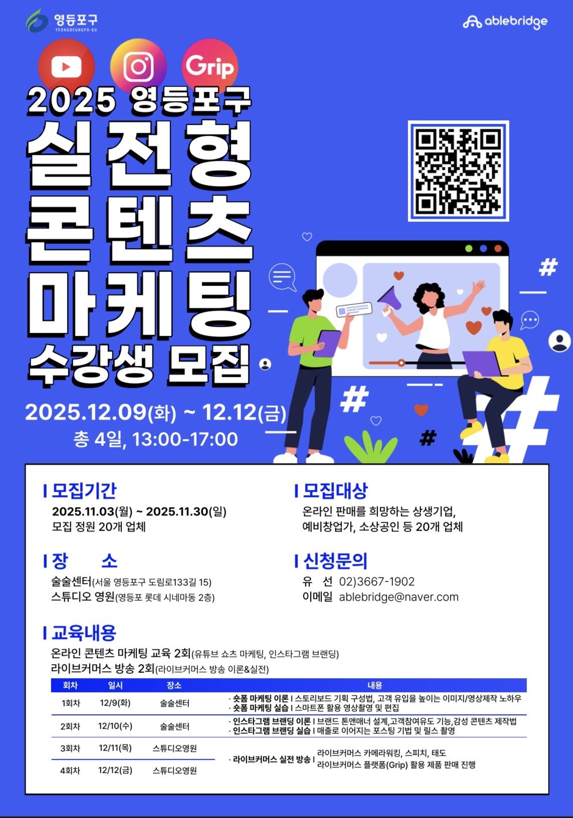 유튜브, 인스타그램을 활용한 온라인마케팅 실습과 라이브커머스 방송까지 경험해볼 수 있는 「2025 영등포구 실전형 콘텐츠 마케팅 프로그램」을 진행합니다. 1. 프로그램명: 실전형 콘텐츠 마케팅 프로그램 2. 신청 대상: 온라인 판매를 희망하는 상생기업, 예비창업가, 소상공인 등 총 20개 업체 3. 신청 기간: 2025. 11. 3.(월) ~ 11. 30.(일) 4. 세부 일정: 2025. 12. 9.(화) ~ 12. 12.(금) [4일간] ▶ 온라인 마케팅 교육 - 기 간: 12. 9.(화) ~ 12. 10.(수) - 내 용: 유튜브 쇼츠 마케팅 & 인스타그램 브랜딩 - 장 소: 술술센터 (도림로133길 15) ▶ 라이브커머스 방송(with 전문 쇼호스트) - 기 간: 12. 11.(목) ~ 12. 12.(금) - 내 용: 라이브커머스 이론 & 실전방송 - 장 소: 스튜디오 영원(경인로 846 롯데시네마동 2층) ※ 라이브커머스 미희망 시 교육만 신청 가능함. 5. 신청 방법: 온라인(포스터QR 통해 접속) 신청 6. 교 육 비: 무료 7. 문 의 처: 에이블브릿지(☎02-3667-1902), 일자리경제과 상공인지원팀(☎02-2670-3961) |