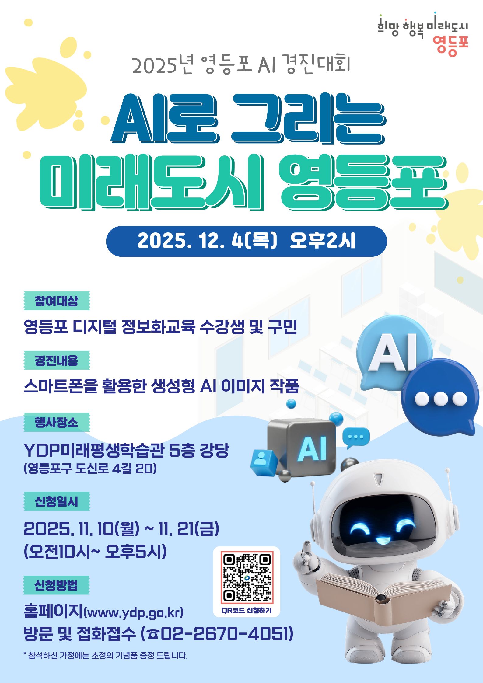 'AI로 그리는 미래도시 영등포' 2025년 영등포 AI 경진대회 참여자를 모집합니다. 참석하신 가정에는 소정의 기념품을 증정 드립니다. |