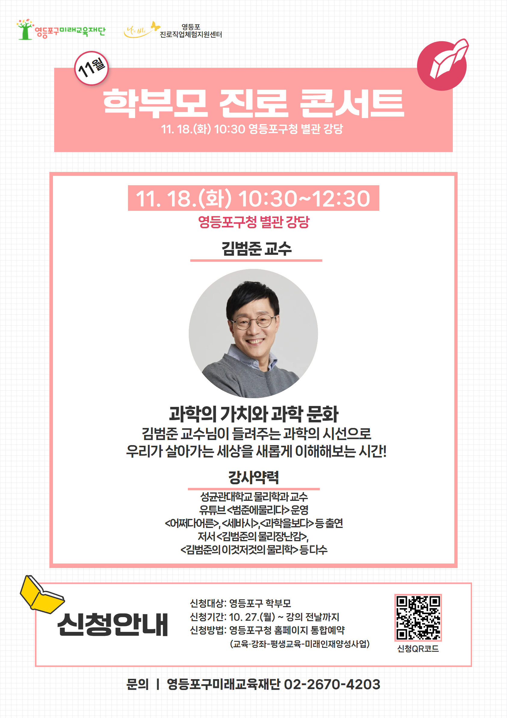 영등포구미래교육재단에서는 관내 학부모님과 구민분들을 위해 11월 “학부모 진로 콘서트”를 진행합니다. 이번 강의는 성균관대학교 물리학과 김범준 교수님을 모시고 <과학의 가치와 과학문화> 특강을 마련했습니다. 과학을 잘 모르는 분들도 괜찮습니다. 이번 특강에서는 과학이 세상을 바라보는 시선과 우리의 삶과 연결된 과학 문화의 가치를 알아봅니다. 관심 있는 분들의 많은 참여 부탁드립니다. [↓신청(통합예약 바로가기)↓] https://www.ydp.go.kr/reserve/selectTnEdcLctreListU.do?key=5693&si1=62&
