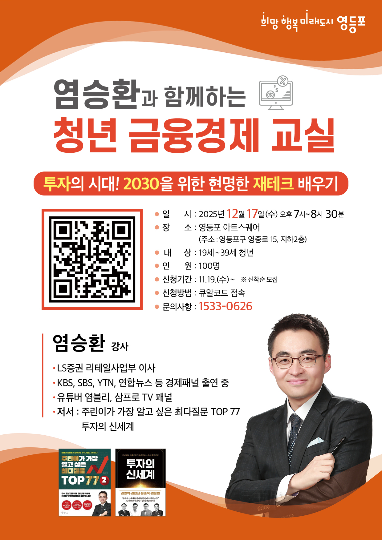 ○ 일 시: 2025. 12. 17.(수) 19:00 ~ 20:30 ○ 장 소: 영등포 아트스퀘어(영등포구 영중로15, 지하2층) ○ 대 상: 19세~39세 청년 ○ 강 사: 염승환(LS증권 리테일사업부 이사) ○ 주 제: 투자의 시대! 2030을 위한 현명한 재테크 배우기 ○ 신청기간: 2025.11. 19.(수) ~ ※선착순 모집 ○ 신청방법: QR코드 및 링크(https://m.site.naver.com/1Veiu)접속하여 신청 ○ 문의기관: 1533-0626(교육기관), 02-2670-7533(영등포구 일자리경제과) |