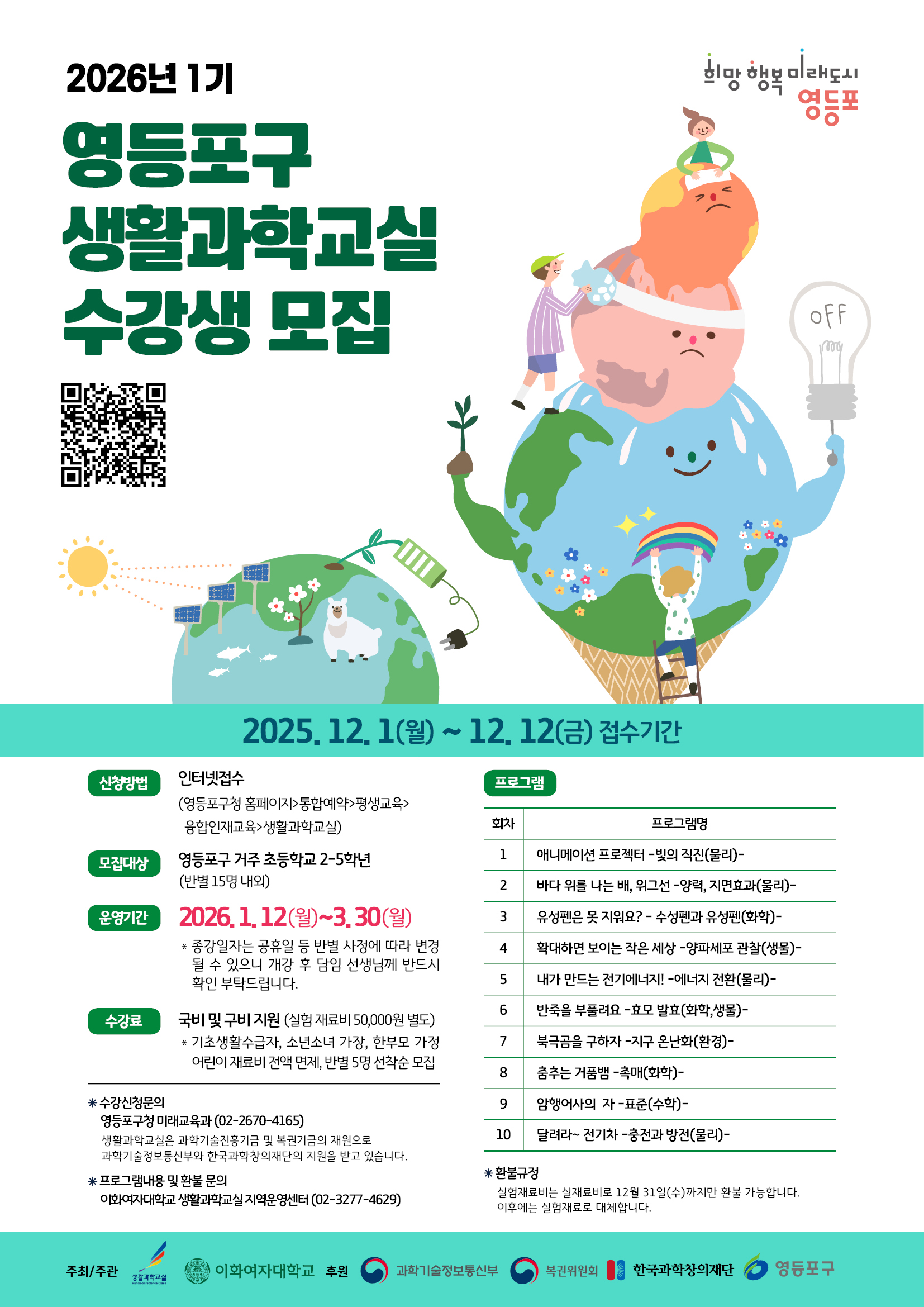 ○ 대 상: 영등포구 거주 초등학교 2~5학년 ⋇ 2025년 현재 ○ 재료비 납부방법: 12월 16일(화) 합격자 발표 후 12월 19일(금)까지 “O반 학생명”으로 납부 ○ 환불 규정: 실험 재료비는 12월 31일(수)까지만 환불 가능하며, 이후에는 실험재료로 대체 됩니다.