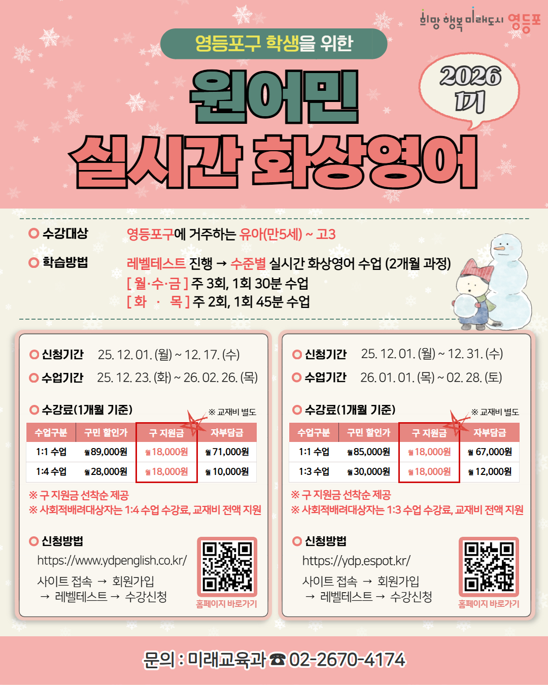 □ 2026 영등포구 원어민 화상영어학습(1기) ○ 신청기간: 홍보 포스터 참고 ○ 수강대상: 영등포구에 거주하는 유아(만 5세) ~ 고3 ○ 학습방법: 레벨테스트 진행 후 수준별 실시간 화상영어 수업 진행 ○ 신청방법: 원하는 학습 사이트 접속 → 회원가입 및 레벨테스트 → 수강신청 - ㈜이앤오즈: https://www.ydpenglish.co.kr/ - ㈜건우애듀: https://ydp.espot.kr/ 위 주소로 접속 또는 홍보 포스터 내 QR코드로 접속 후 신청 ○ 문의: 02-2670-4174 |