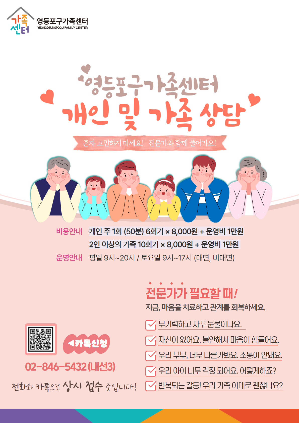 영등포구가족센터 개인 및 가족상담 혼자 고민하지 마세요! 전문가와 함께 풀어가요! 운영: 평일09시~20시, 토요일 9시~ 17시(대면, 비대면) 문의: 영등포구가족센터 02-846-5432(내선 3번) |