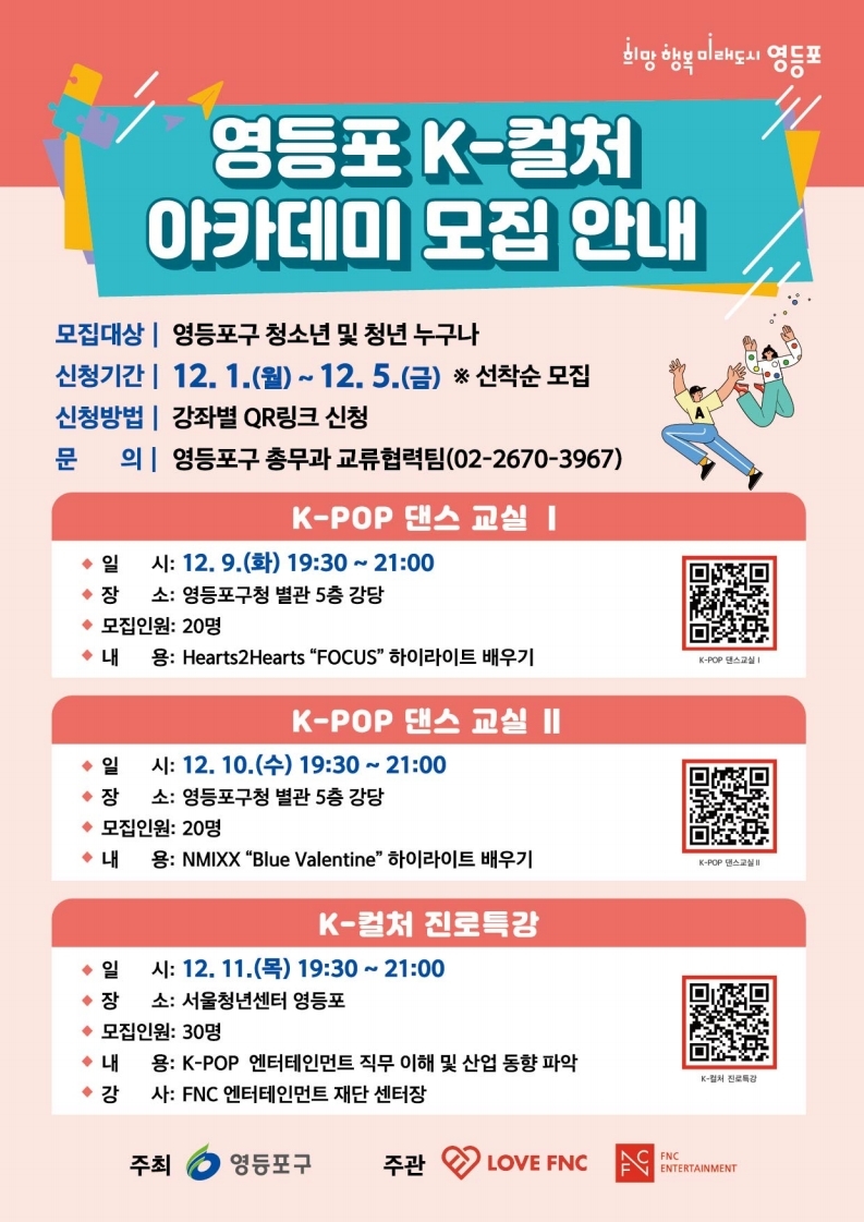 우리구소식 홈 >영등포소식 >새소식 >우리구소식 프린트하기 sns 공유하기 페이스북 공유하기 블로그 공유하기 트위터 공유하기 공유하기 공유하기 작성일 2025.12.01 우리구소식 상세보기 - , 제목, 내용, 부서, 연락처, 파일, 작성일, 공공누리의 정보를 제공합니다. FNC Ent.와 함께하는 "K-POP 댄스교실" 모집 안내 이미지 확대보기 - 모집대상: 영등포구 청소년 및 청년 - 모집인원: 강좌별 QR 신청 ※선착순 모집 - 신청기간: 12. 1.(월) 9:00 ~ 12. 5.(금) 18:00 - 신청방법: 온라인신청(QR코드 스캔) ▶댄스교실Ⅰ 신청: 네이버폼 ☜ 클릭! ▶댄스교실Ⅱ 신청: 네이버폼 ☜ 클릭! 부서 총무과 연락처 02-2670-3967 파일 jpg 파일 ★영등포 K-컬처 아카데미 모집 안내(전단지).jpg 미리보기 pdf 파일 ★영등포 K-컬처 아카데미 모집 안내(전단지).pdf 미리보기 공공누리 목록 이전글 차이나는 과학클라스(12월)「사이언스 버스킹(연말특집 과학콘서트)」, 「인공지능 작곡가(AI 작사·작곡 체험)」 참여가족 모집! 다음글 ★주말특강 대입편 2탄★ 학생부 평가와 개선방안 실제 사례 안내 <학부모 진학 아카데미>