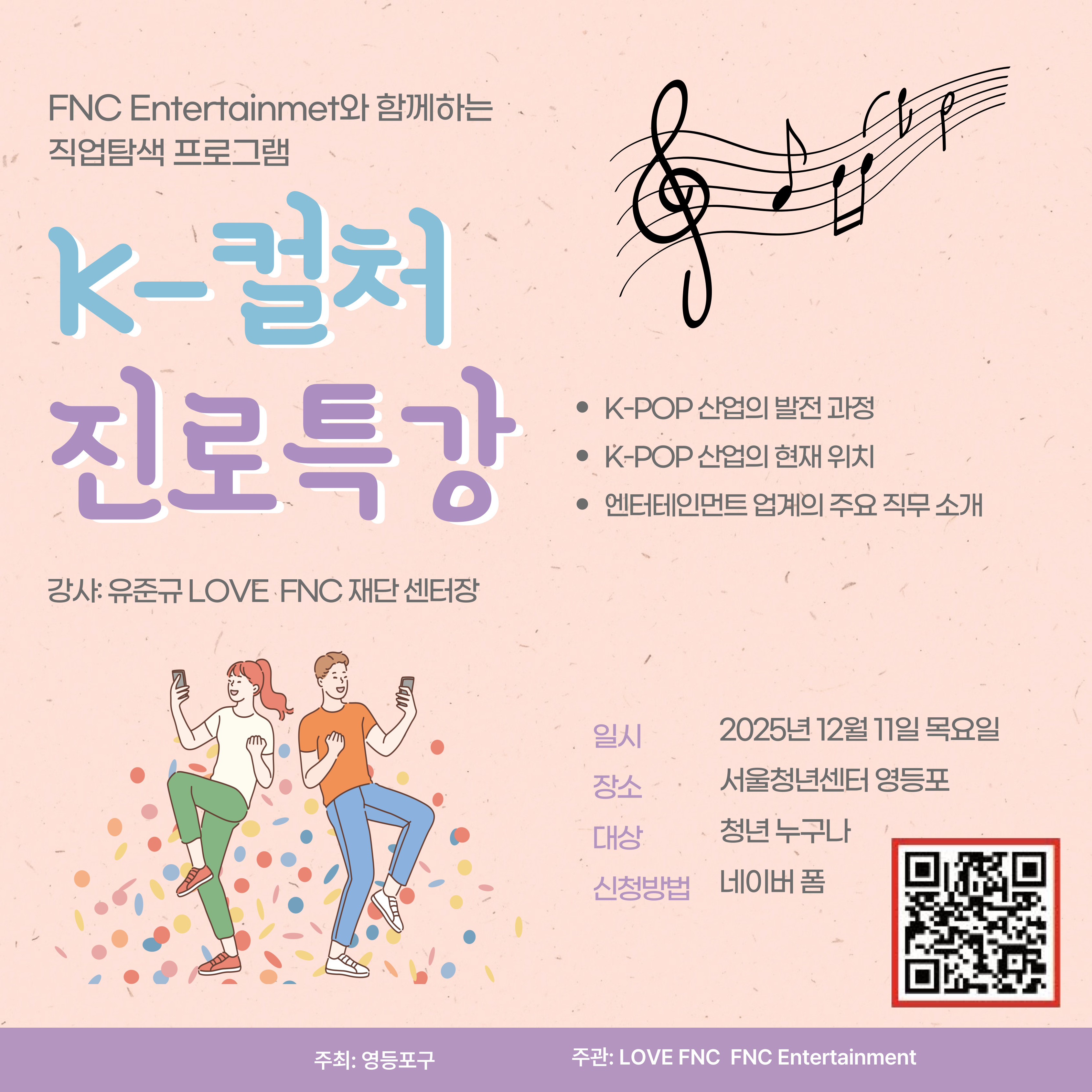 | FNC Ent. 재단 센터장이 진행하는 "K-컬처 진로특강" 모집 안내 | |