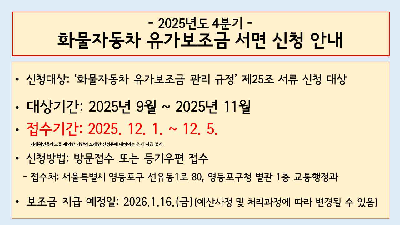 | 2025년 4분기 유가보조금 서면신청 안내 | |