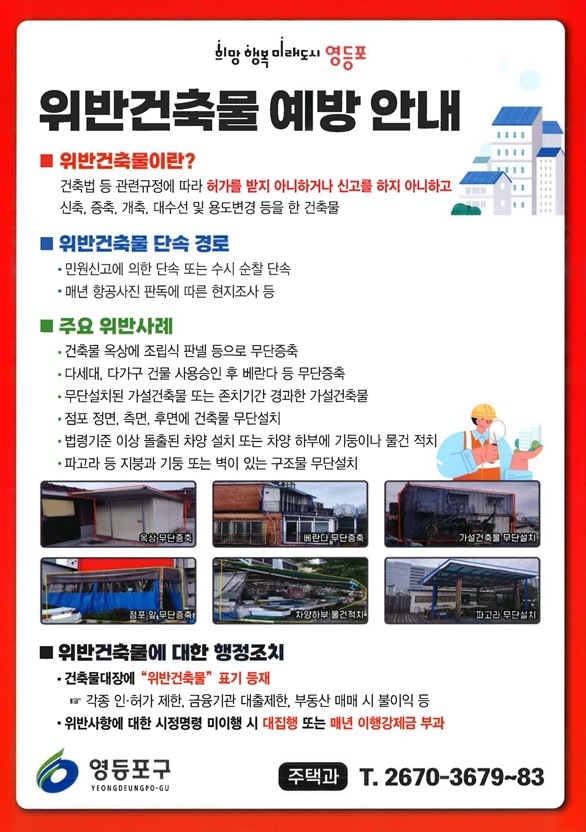 구청소식 홈 >동주민센터 >도림동 >우리동소식 >구청소식 프린트하기 sns 공유하기 페이스북 공유하기 블로그 공유하기 트위터 공유하기 공유하기 공유하기 작성일 2025.12.05 구청소식 상세보기 - , 제목, 내용, 부서, 연락처, 파일, 작성일, 공공누리의 정보를 제공합니다. 위반건축물 예방 안내 이미지 확대보기 부서 주택과 연락처 02-2670-3679 파일 pdf 파일 위반건축물 예방 안내문.pdf 미리보기 jpg 파일 위반건축물 예방 안내.jpg 미리보기 공공누리 목록 다음글 2026년 영등포구 상반기 노숙인 거리상담원 채용 공고