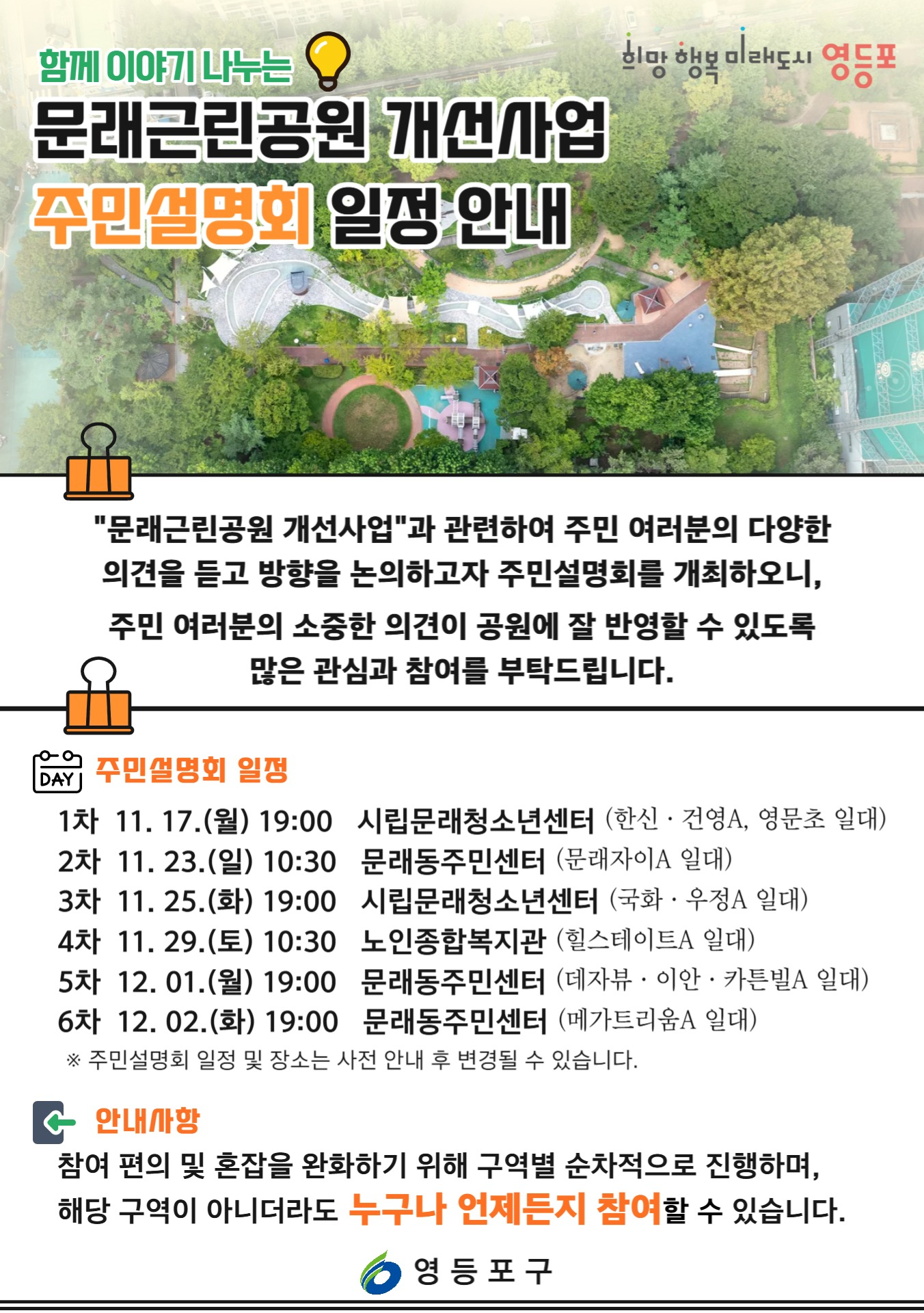 | 문래근린공원 개선사업 주민설명회 일정 안내 | |