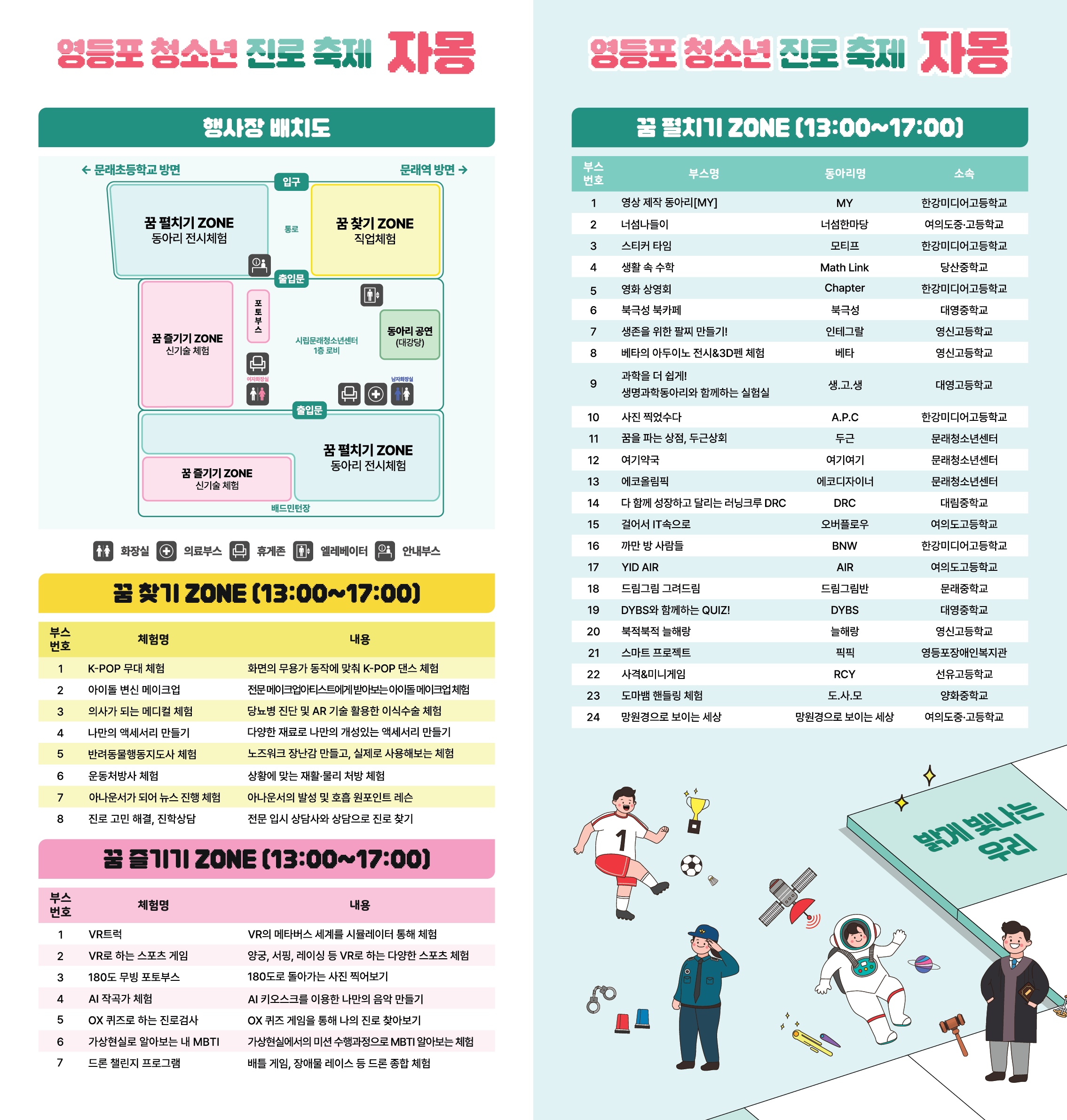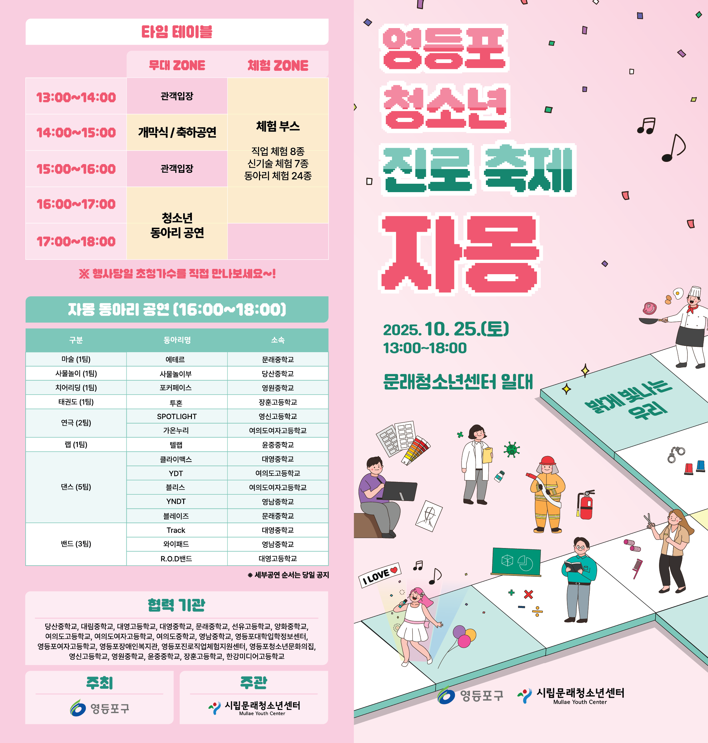 ♡ 2025 영등포 청소년 진로 축제 '자몽'을 개최합니다 ♡ □ 일시: 2025. 10. 25.(토) 13:00~18:00 □ 장소: 시립문래청소년센터 일대(문래로 110) □ 내용 - (꿈 즐기기 ZONE) VR, 드론, AI 등 신기술 체험 - (꿈 펼치기 ZONE) 청소년 동아리 전시·체험 부스 (24팀) - 청소년 동아리 무대 공연 (15개팀) ☆ 별도의 참가비 없이 누구나 자유롭게 참여 가능합니다! ☆ ※ 주차 공간이 없으니 대중교통 이용 바랍니다. |