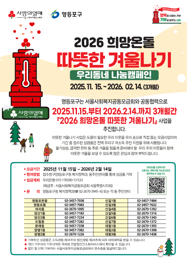 서울사회복지공동모금회와 영등포구가 민관협력으로 추진하는「 2026 희망온돌 따뜻한 겨울나기」사업에 많은 관심과 참여 바랍니다. ○ 추진기간: 2025.11.15.(토) ~ 2026.02.14.(토) (3개월간) ○ 성금계좌: 우리은행 015-176590-13-533 (예금주: 사회복지공동모금회 서울특별시지회) ○ 문 의: 복지정책과 (☎02-2670-3945~6) |