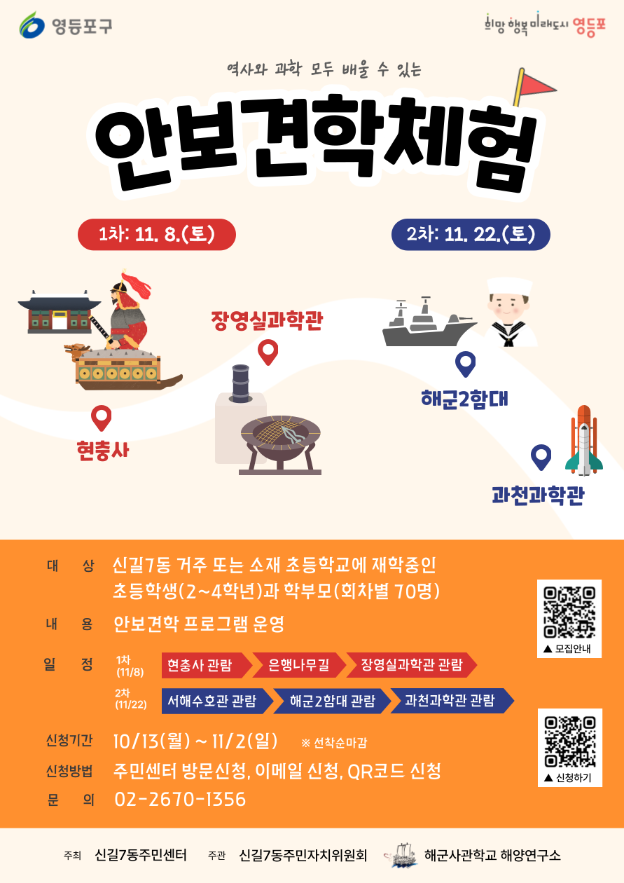 신길7동에서 어린이와 학부모를 대상으로 「안보견학 체험프로그램」 을 운영하오니, 주민 여러분의 많은 관심과 참여 바랍니다. [2회차] 11. 22.(토) 09:00~18:00 / 서해수호관·해군2함대, 국립과천과학관 - 내 용: 해양안보와 과학기술을 함께 배우는 체험형 견학 프로그램 - 참가비: 무료 - 주 최: 신길7동주민센터 - 주 관: 신길7동주민자치위원회 - 문 의: ☎ 02-2670-1356 - 참가인원: 회차별 70명 (선착순) ※ 모집 정원 초과 시 1·2회차를 모두 신청한 참가자 우선 선정 - ★ 신청기간: 2025. 10. 13.(월) ~ 11. 2.(일) ★ ※ 제출서류를 바탕으로 참가자격요건 확인 후 접수 확인 문자를 추후에 일괄발송할 예정입니다. |