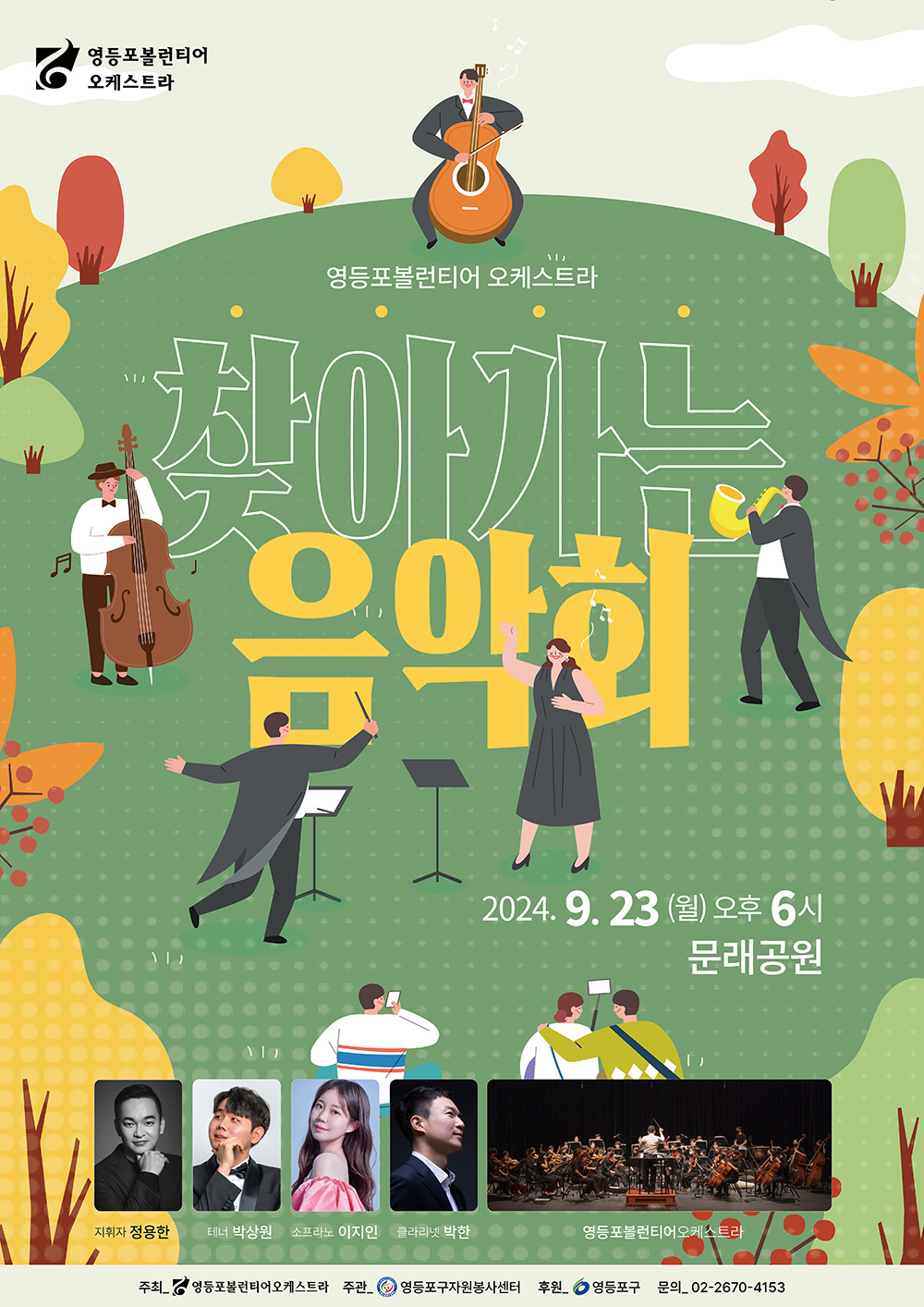 1. 행 사 명: 영등포볼런티어오케스트라 <구민의날 기념 찾아가는 음악회> 2. 일 시: 2024. 9. 23(월) 18:00 ~ 19:00 3. 장 소: 문래근린공원 특설무대(문래동 3가 61) 4. 참석 인원: 오케스트라 단원 20명(지휘 정용한), 구민 누구나(무료) 5. 특별 출연: 테너 박상원, 소프라노 이지인, 클라리넷 박한 6. 내 용 - 스튜디오 지브리의 ost 등 - 테너 박상원, 소프라노 이지인: 라푼젤, 인어공주, 미녀와 야수 등 - 밤양갱 등 대중음악 - 박한: 클라리넷 솔로 |
