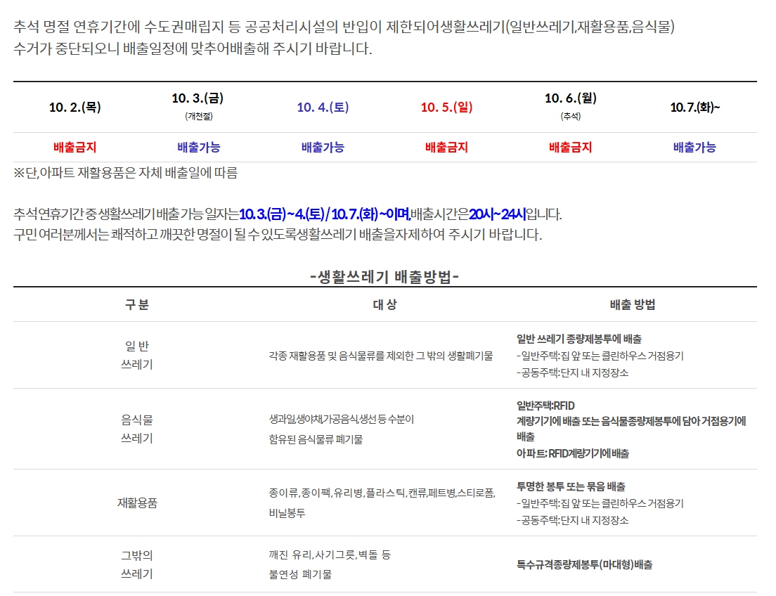 2025년 추석 연휴 쓰레기 배출일정 안내 | |
