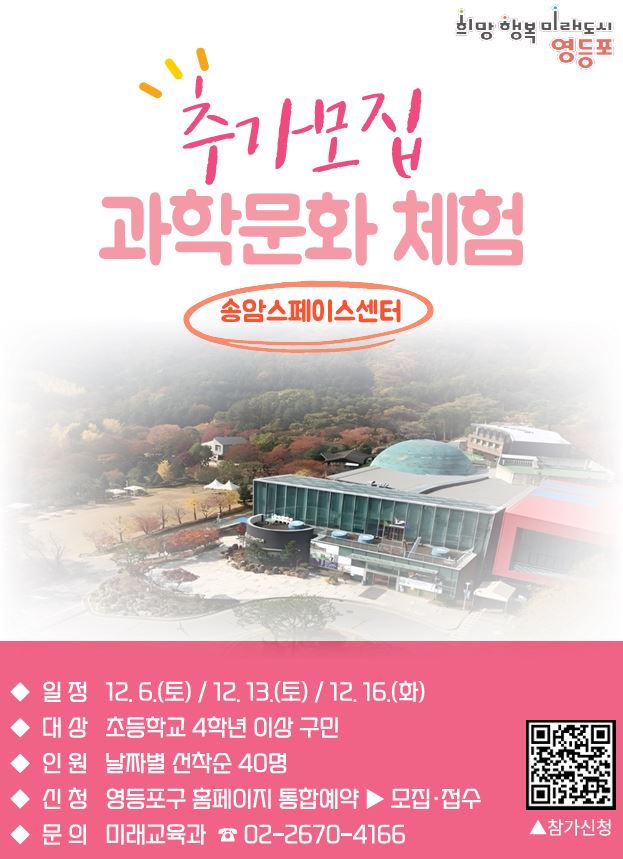 ◇ 장 소: 송암스페이스센터(경기도 양주시 장흥면 권율로185번길 103) ◇ 대 상: 초등학교 4학년(2015년생) 이상 구민 ◇ 인 원: 날짜별 40명 선착순 ◇ 신청기간: 11. 19.(수) 09:00부터 마감시까지 ◇ 신청방법: 영등포구 홈페이지 통합예약▶모집·접수▶신청하기(중복 제외) ◇ 주요내용: 천문대 관측 등 우주과학 일일체험 프로그램 ※ 붙임 일정표 확인, 동절기는 에어로켓 발사 미운영으로 퀴즈 프로그램으로 대체 ◇ 문 의: 영등포구청 미래교육과 과학교육팀(02-2670-4166) |