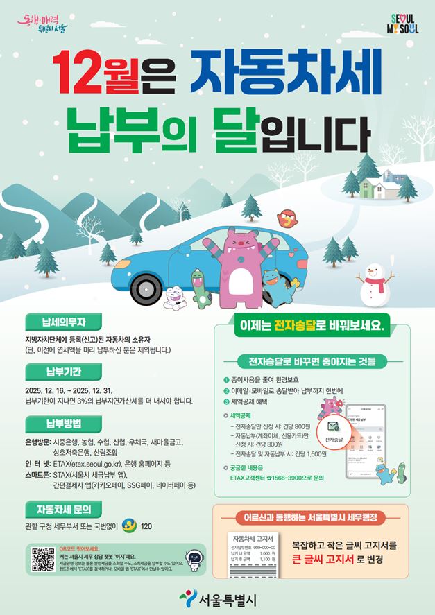 우리동소식 홈 >동주민센터 >영등포동 >우리동소식 >우리동소식 프린트하기 sns 공유하기 페이스북 공유하기 블로그 공유하기 트위터 공유하기 공유하기 공유하기 조회수 5 작성일 2025.12.09 우리동소식 상세보기 - , 제목, 내용, 파일, 조회수, 작성일의 정보를 제공합니다. ☆ 12월은 자동차세 납부의 달입니다. ☆ 이미지 확대보기 - 파일 jpg 파일 2025년 2기분 자동차세 납부.JPG 미리보기 목록 이전글 영등포동 작은도서관 휴관일 변경 안내 다음글 영등포동 통장 모집 공고(제20통)
