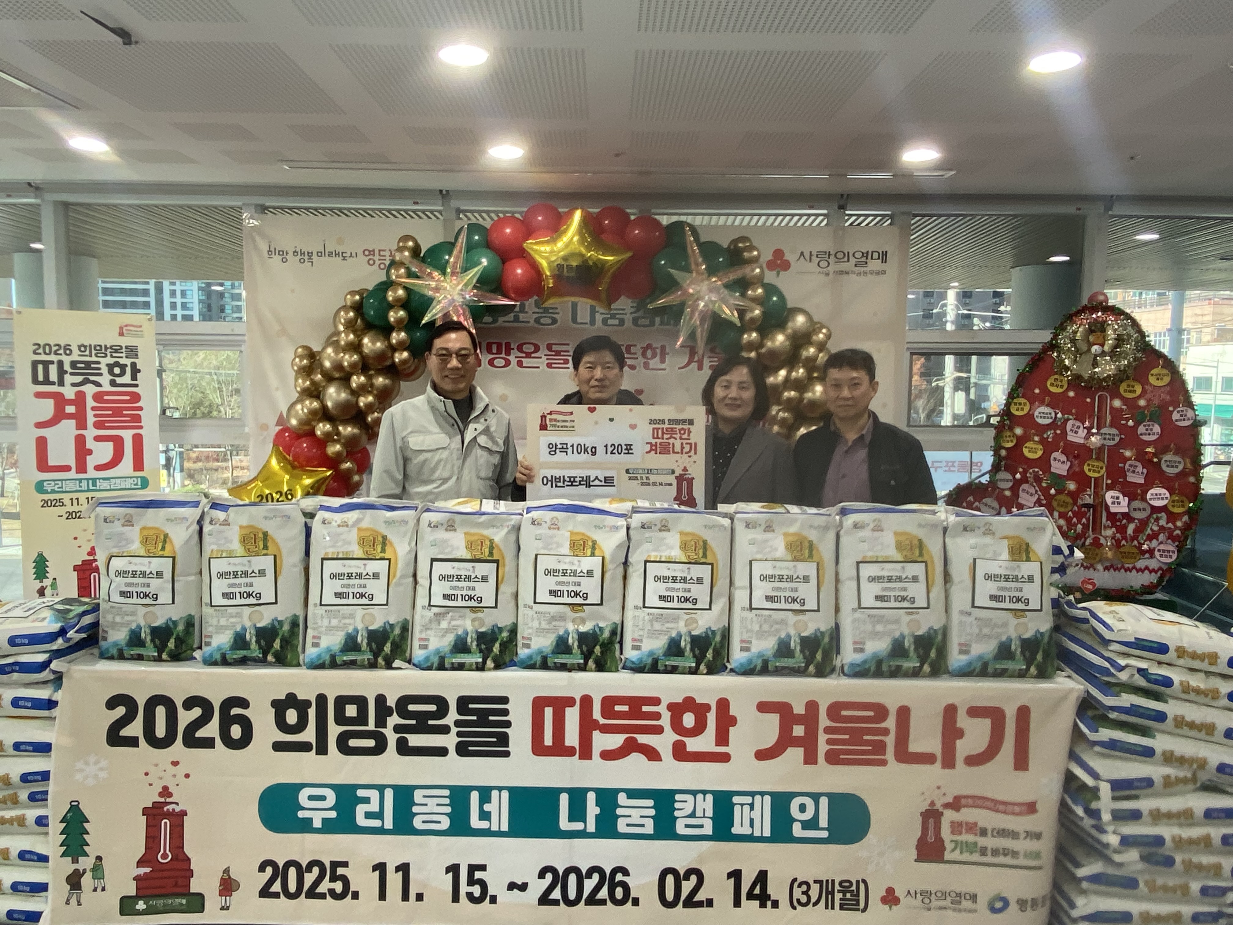 2.장소: 영등포동주민센터 2층 다목적회의실 3.내용: 양곡10kg 120포 기부 4.후원: 어반포레스트 영등포점(대표 이만선) |