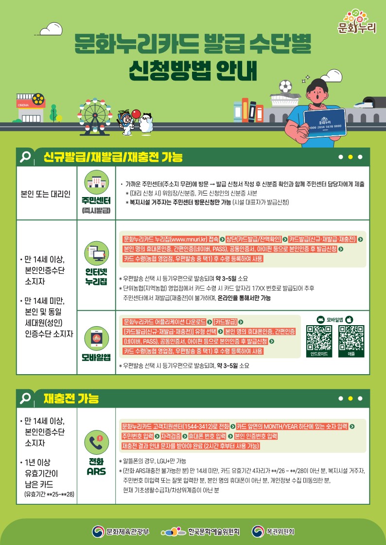 ■ 지원내용: 전국 문화예술·국내관광·체육활동 관련 가맹점에서 이용 가능한 문화누리카드 발급 ■ 지원금액: 1인당 연 14만 원 ■ 발급기간: 2025년 2월 3일(월) ~ 2025년 11월 28일(금) ※주민센터·온라인 발급기간 동일(2025년 11월 28일까지) ※주민등록주소지(시·군·구 기준) 예산 소진 시 발급이 조기 마감 ■ 사용기간: 발급일로부터 2025년 12월 31일(수)까지 ※ 사용처: 문화누리카드 누리집 사이트에서 확인 => http://www.mnuri.kr/main/main.do ※ 잔액확인 및 문의 1544-3412 |