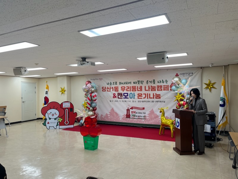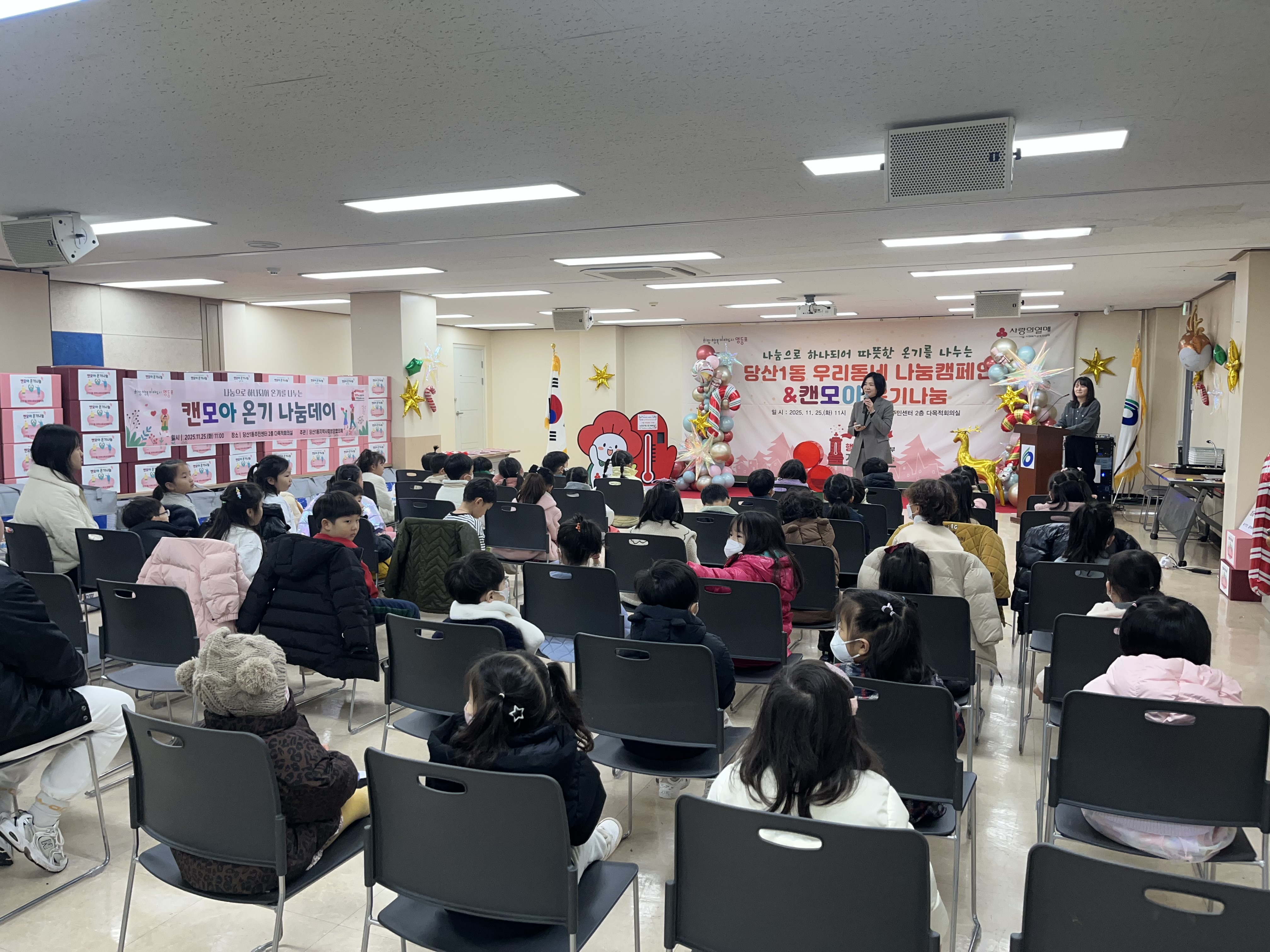 ○ 장소: 당산1동주민센터 2층 회의실 ○ 진행순서 1. 성금 후원 어린이집 기념 전달식 2. 따뜻한 겨울나기 성금품전달식 3. 캔모아 온기나눔 행사 |