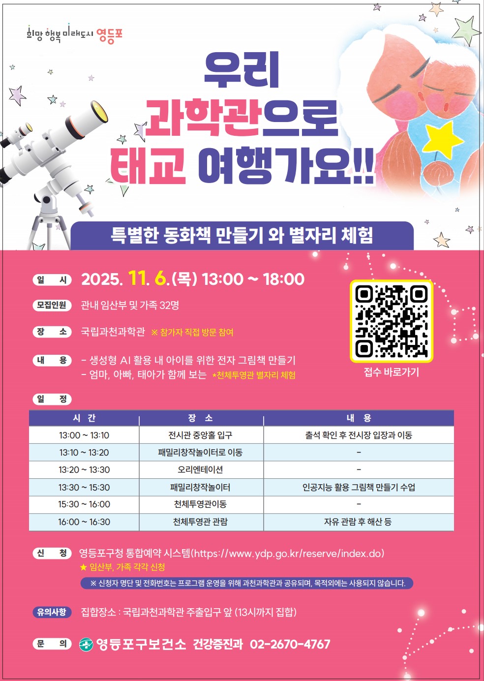 - 나만의 동화책 만들기 와 별자리 체험 - □ 모집대상: 임산부 및 가족 32명 ※ 임산부, 가족 각각 신청 □ 일 시: 2025. 11. 6.(목) 13:00 ~ 18:00 □ 장 소: 국립 과천과학관(과천시 상하별로 110) ※ 과학관까지 개별 이동 □ 신 청: 영등포구청 홈페이지 통합예약 서비스 □ 내 용 ○ 생성형 AI를 활용하여 나만의 그림책 만들기 ○ 태아와 함께 보는 천체투영관 별자리 체험 □ 신청기간: ~ 11.4.(화) 18시까지(선착순 마감) □ 문의 : 영등포보건소 건강증진과 모자보건팀(02-2670-4767) |