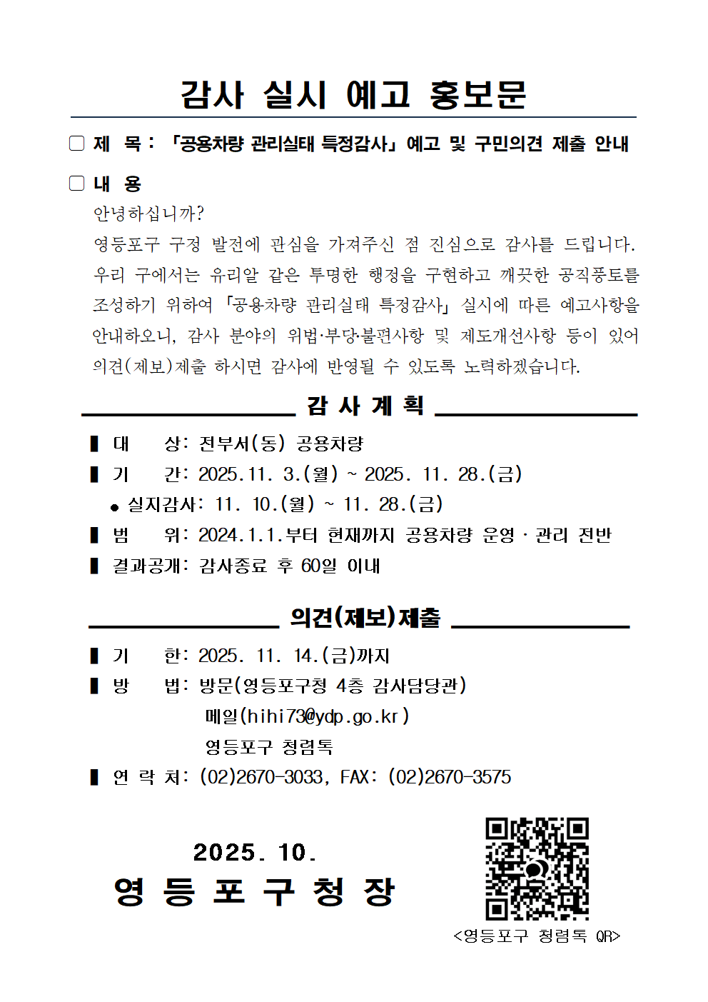 우리동소식 홈 >동주민센터 >문래동 >우리동소식 >우리동소식 프린트하기 sns 공유하기 페이스북 공유하기 블로그 공유하기 트위터 공유하기 공유하기 공유하기 조회수 6 작성일 2025.11.04 우리동소식 상세보기 - , 제목, 내용, 파일, 조회수, 작성일의 정보를 제공합니다. 감사 실시 예고 홍보문 이미지 확대보기 「공용차량 관리실태 특정감사」예고 및 구민의견 제출 안내 파일 bmp 파일 2. 감사실시 홍보문001.bmp 미리보기 목록 이전글 「내 안전 지키는 안심헬프미」 지원사업 안내 다음글 영등포 청년 창업 도약 아카데미 운영 안내