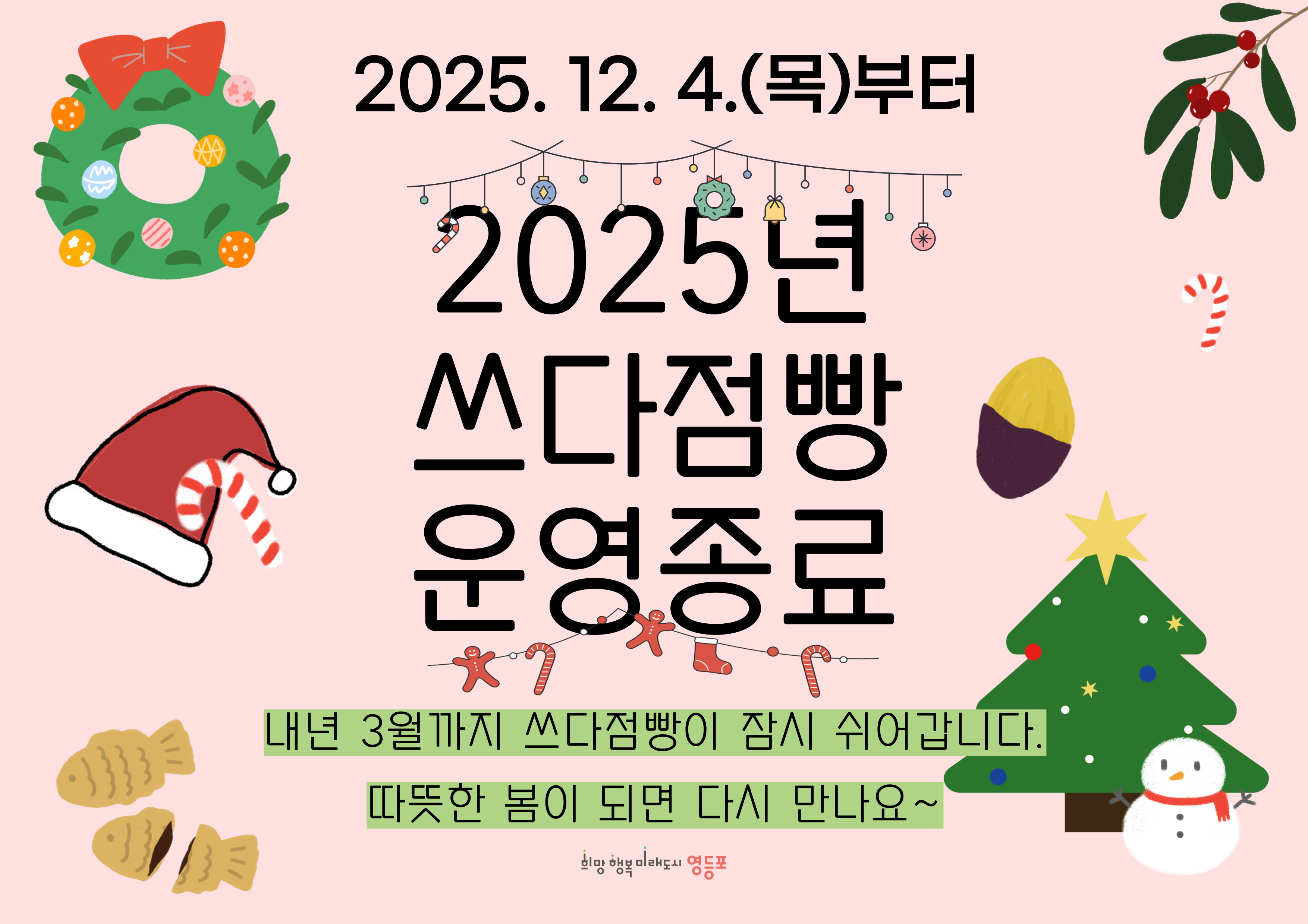 우리동소식 홈 >동주민센터 >문래동 >우리동소식 >우리동소식 프린트하기 sns 공유하기 페이스북 공유하기 블로그 공유하기 트위터 공유하기 공유하기 공유하기 조회수 7 작성일 2025.11.21 우리동소식 상세보기 - , 제목, 내용, 파일, 조회수, 작성일의 정보를 제공합니다. 2025년 쓰다점빵 운영 종료 안내 이미지 확대보기 이용에 참고하시기 바랍니다. 파일 jpg 파일 쓰다점빵 운영 종료.jpg 미리보기 목록 이전글 2025 YDP창의예술교육센터 결과공유축제 둥둥제 행사 안내 다음글 영등포구 미래세대 명사특강 안내
