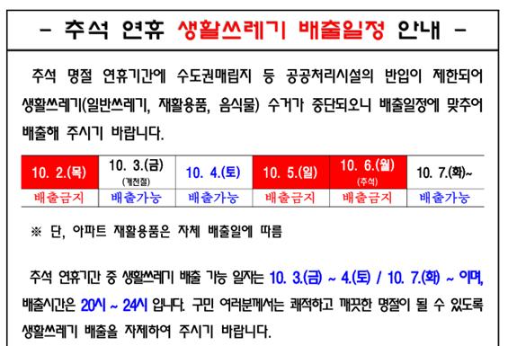 추석 연휴 쓰레기 배출일자 안내 드립니다. | |