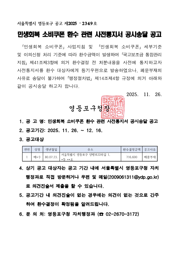 민생회복 소비쿠폰 환수 관련 사전통지서 공시송달 공고 |
