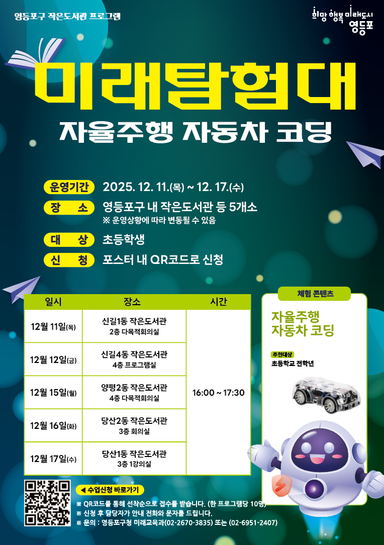 ○ 운영기간: 2025. 12. 11.(목) ~ 12.17.(수) ○ 장 소: 영등포구 내 작은도서관 등 5개소(포스터 참조) ○ 대 상: 초등학생 ○ 신 청: 포스터 내 QR코드로 신청(선착순 접수 프로그램당 10명) |